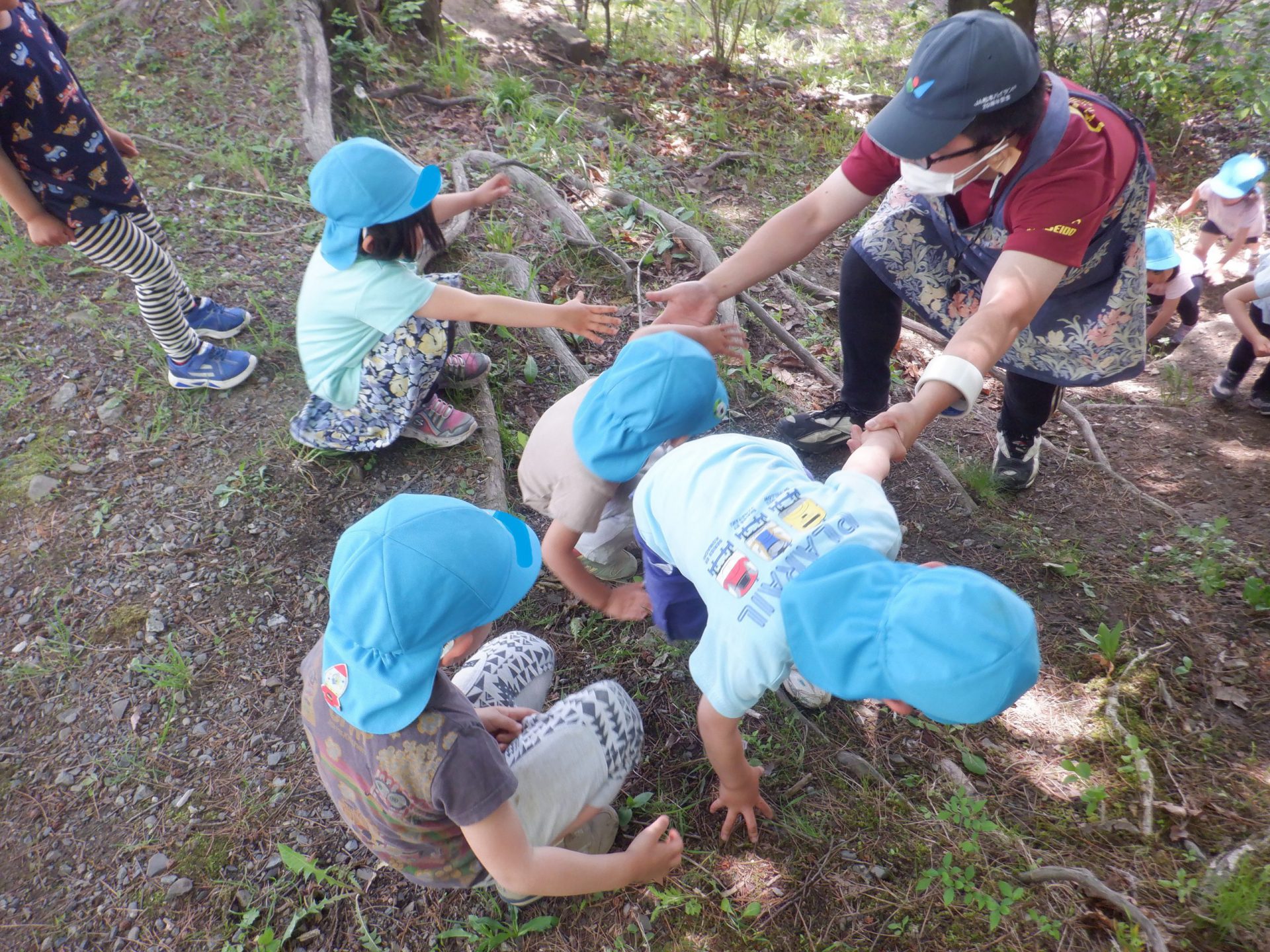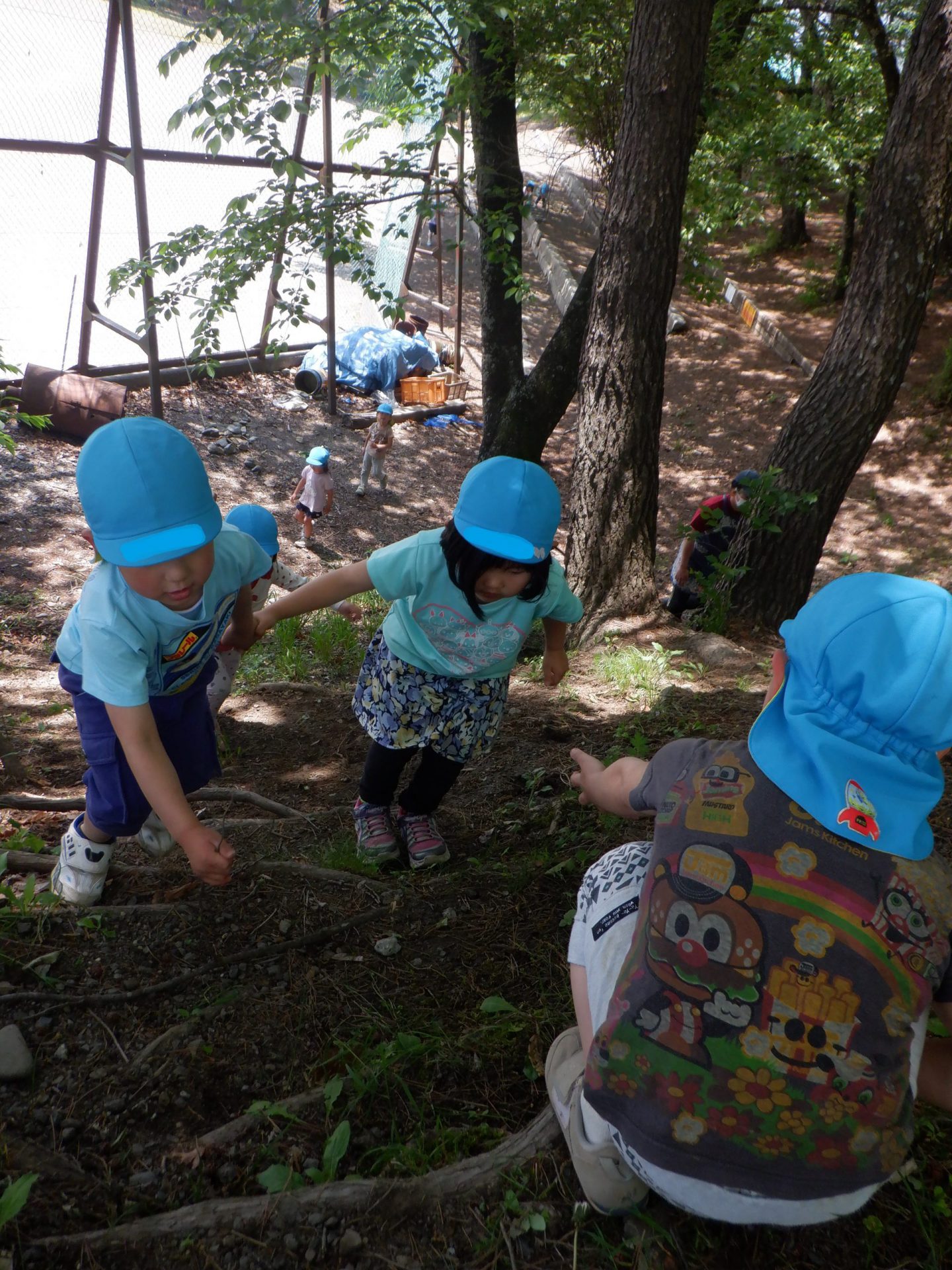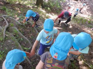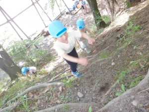 林の中のメインアトラクションとなる“土手”です。昨年の年少の頃には怖がっていた子も、今ではもうへっちゃらだもん!でも、上から見てみると、大人もちょっと怖いですね💦