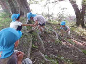 この林は子ども達が年長になっても、小学校へ進んでもお世話になる林です。そんな素敵な財産となる小学校林をこれからも大切にしていきたいし、涼しい秋になればた~くさん遊んでいきたい場所ですね。