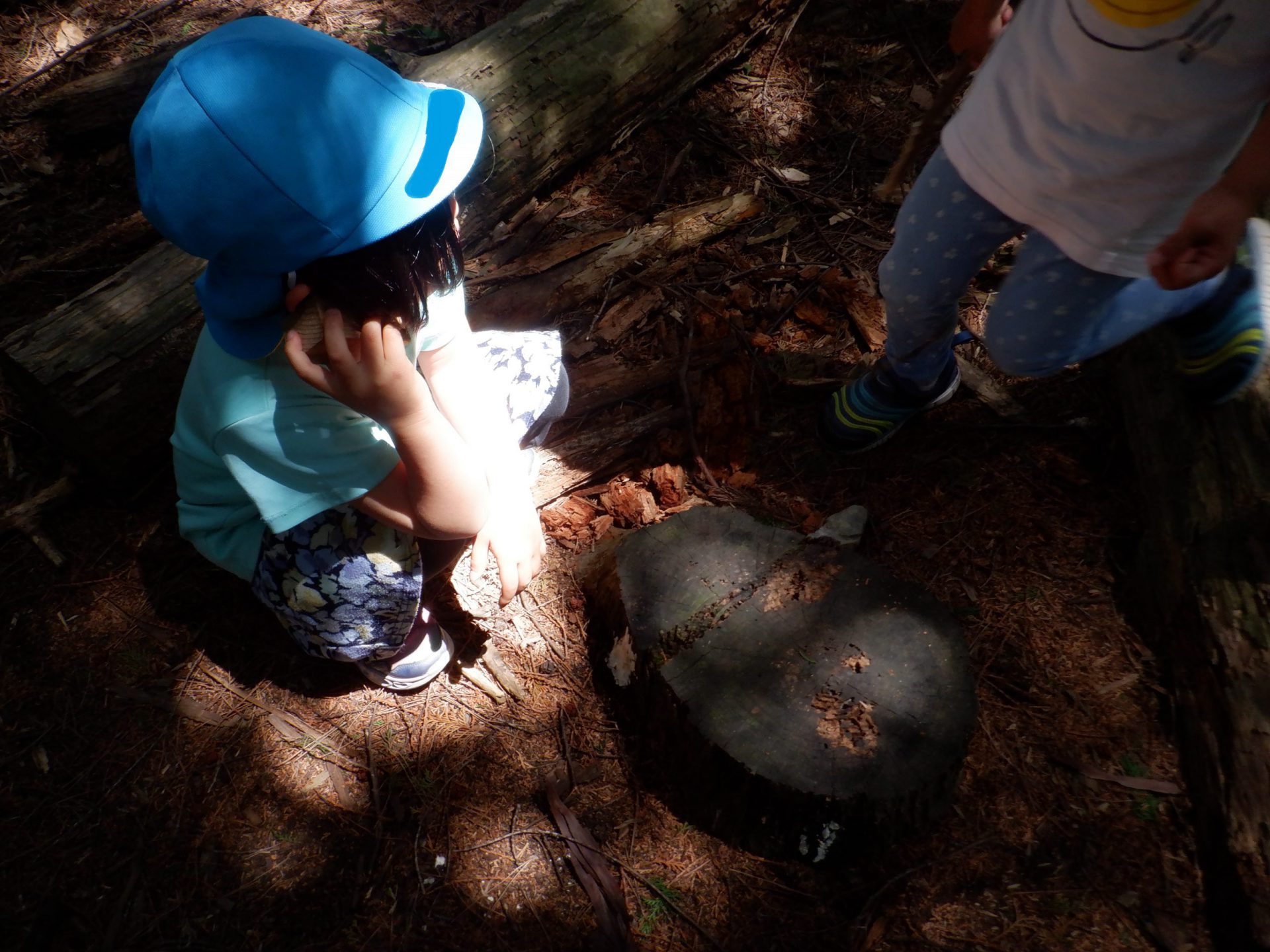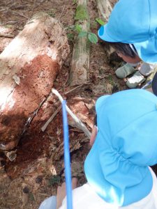 林の中には朽ちた木がゴロゴロと!「むしがいるかも!」と早速削っていきます。ちょうど幼虫もおり(幼虫さん、驚かせてごめんなさいね。)、「いたいた!」と大賑わいでした。