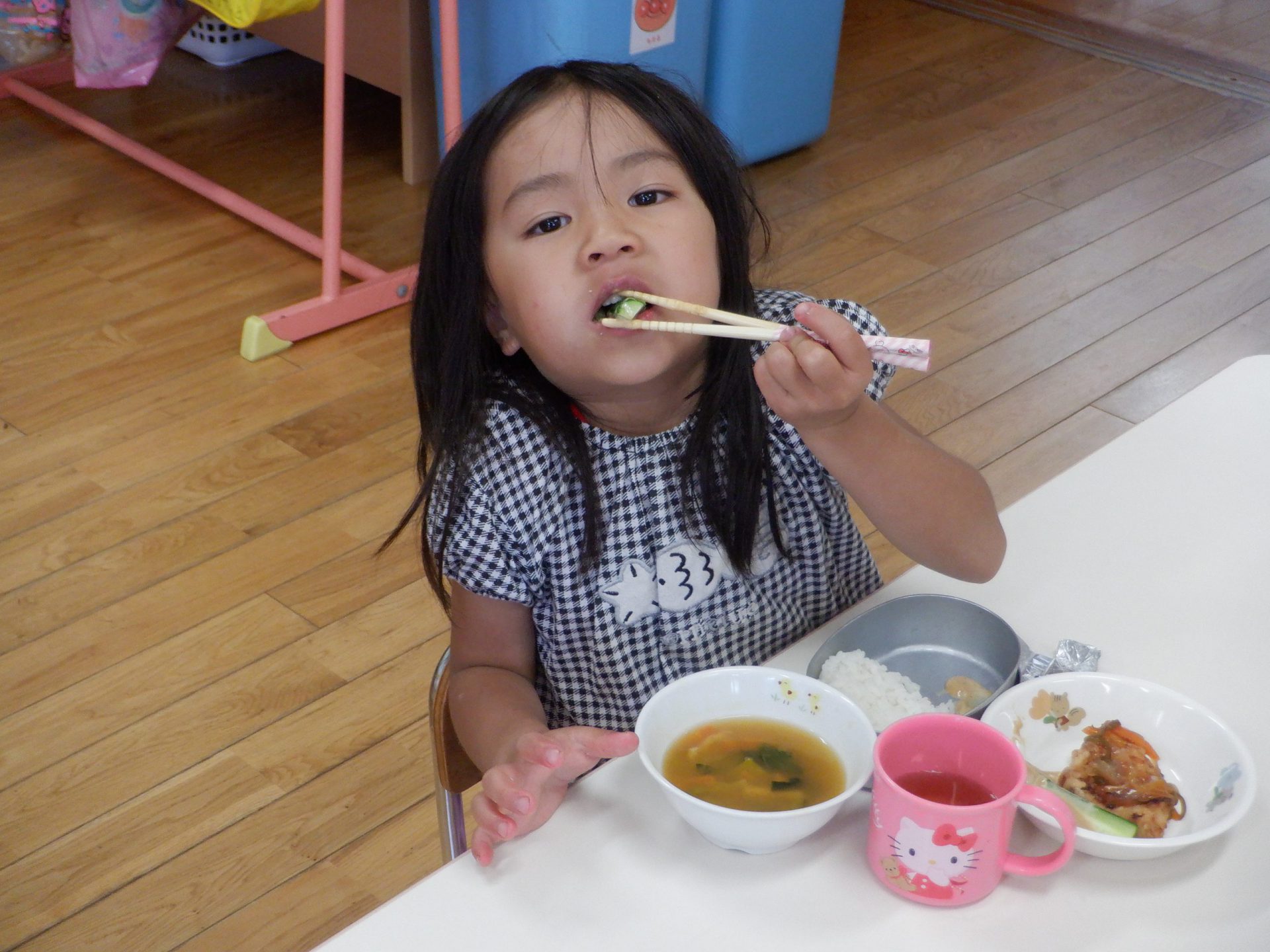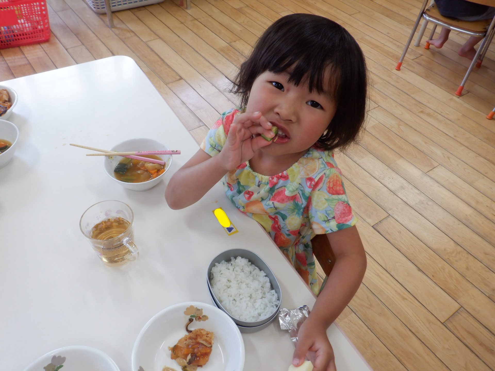 収穫したキュウリを、給食先生が洗って下さりました。「みそをつけなくても、おいしい~。」西箕輪の大地の味を噛み締めます。