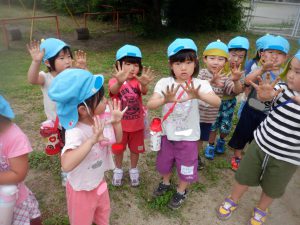 畑から戻って来た子ども達。畑仕事を頑張った仕事人の手です。その後はどろんこ遊びを楽しみました。