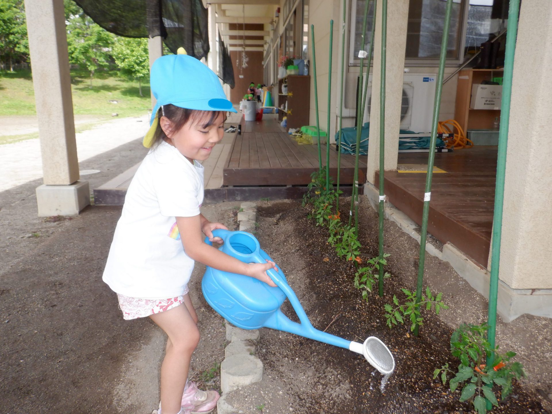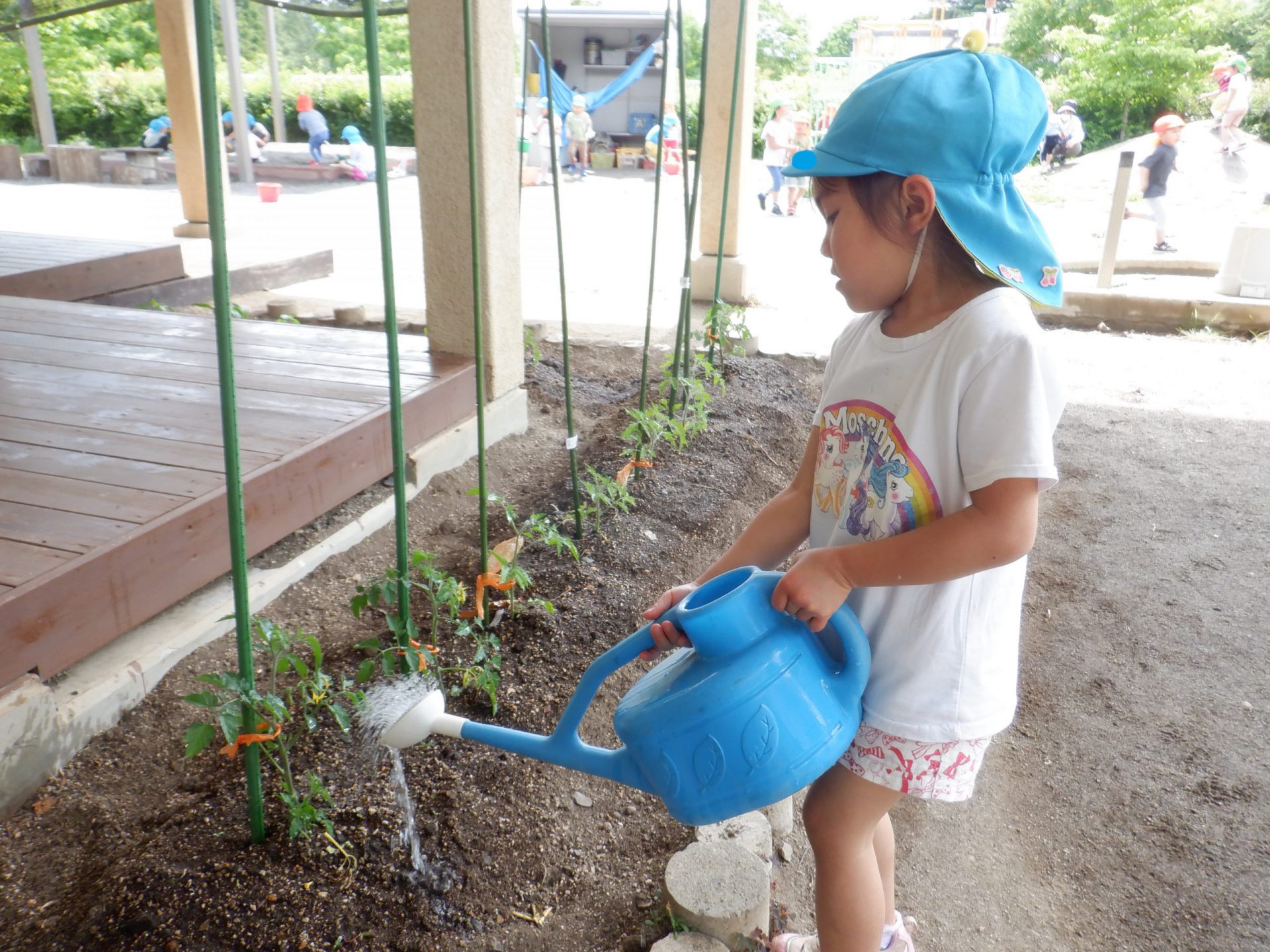 保育園の庭にも小さいながら畑があります。重いジョウロを持ちながら、水やりです。