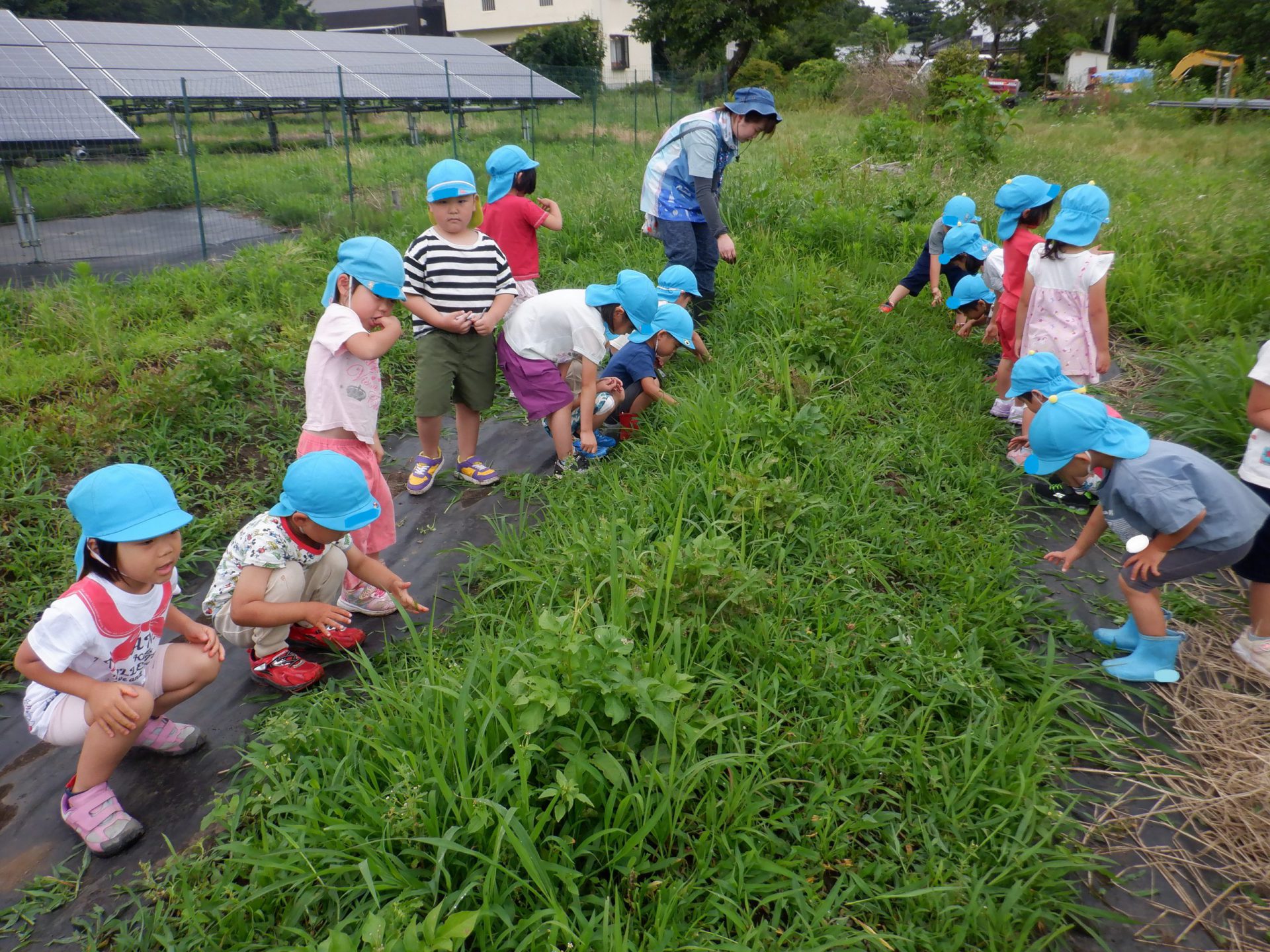 ある日の畑。年長さんの依頼を受け、年中さんで畑の雑草取りに出かけました。ジャガイモを植えた畝ですが、どこがジャガイモか分からないよ~。