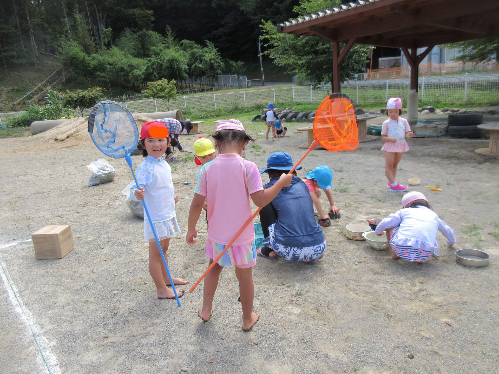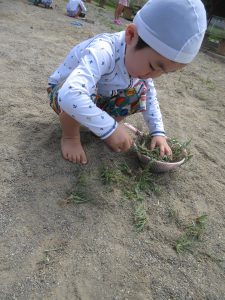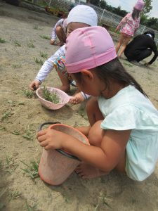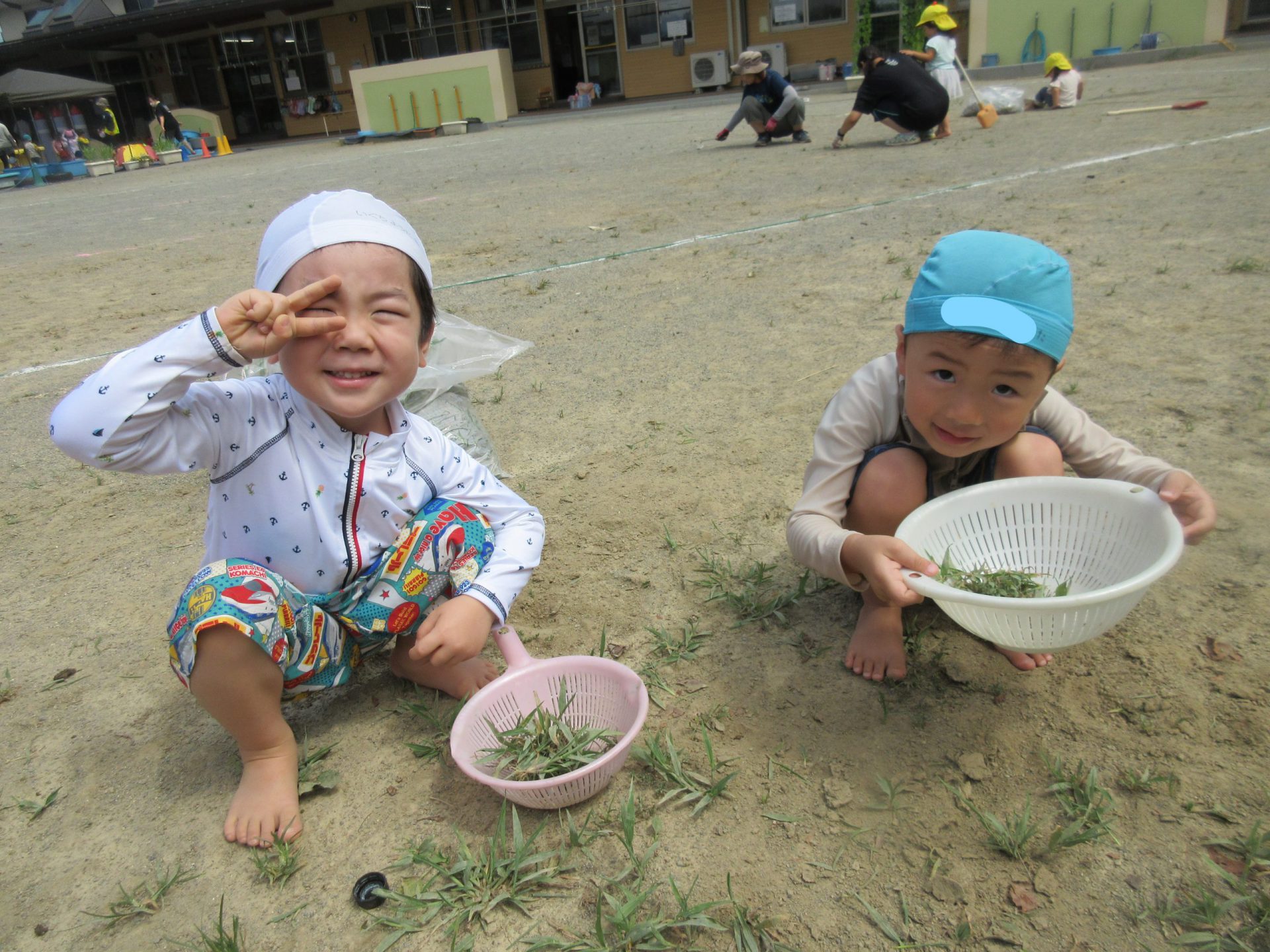 猛暑の続く今日この頃、久しぶりに曇りになりました。地域の民生児童委員の方々のご厚意で、園庭の草取りをしていただいています。この日は少し涼しいので 職員も久しぶりに草取りをはじめると、今日は2歳さんと共に年中さんもお手伝いしてくれました