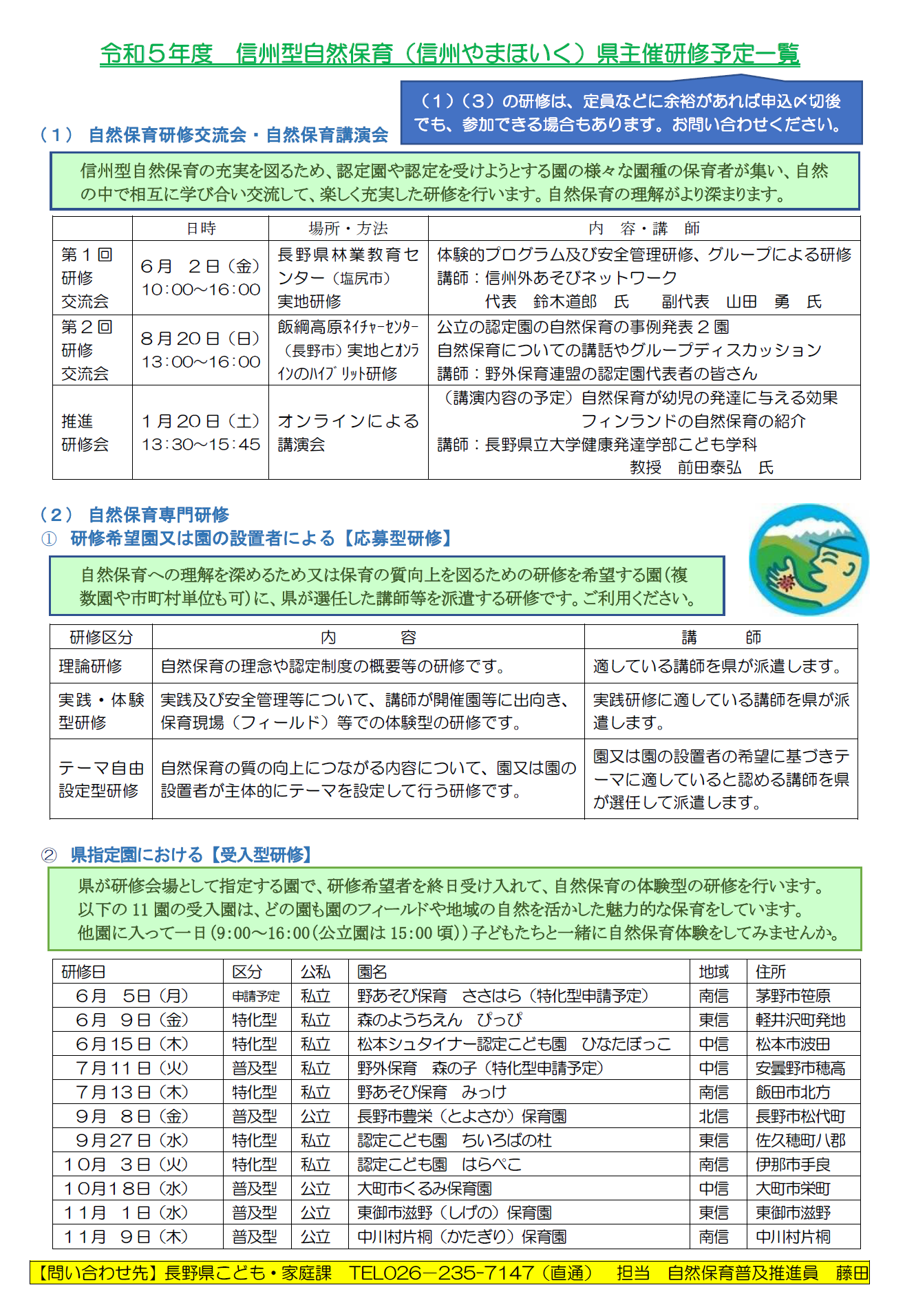 今年度も信州型自然保育に係る保育者の質の向上を目的として、認定園、認定を希望又は予定している園、信州型自然保育に興味のある保育者や市町村担当者等の皆様に向けて下記一覧の研修会を行います。