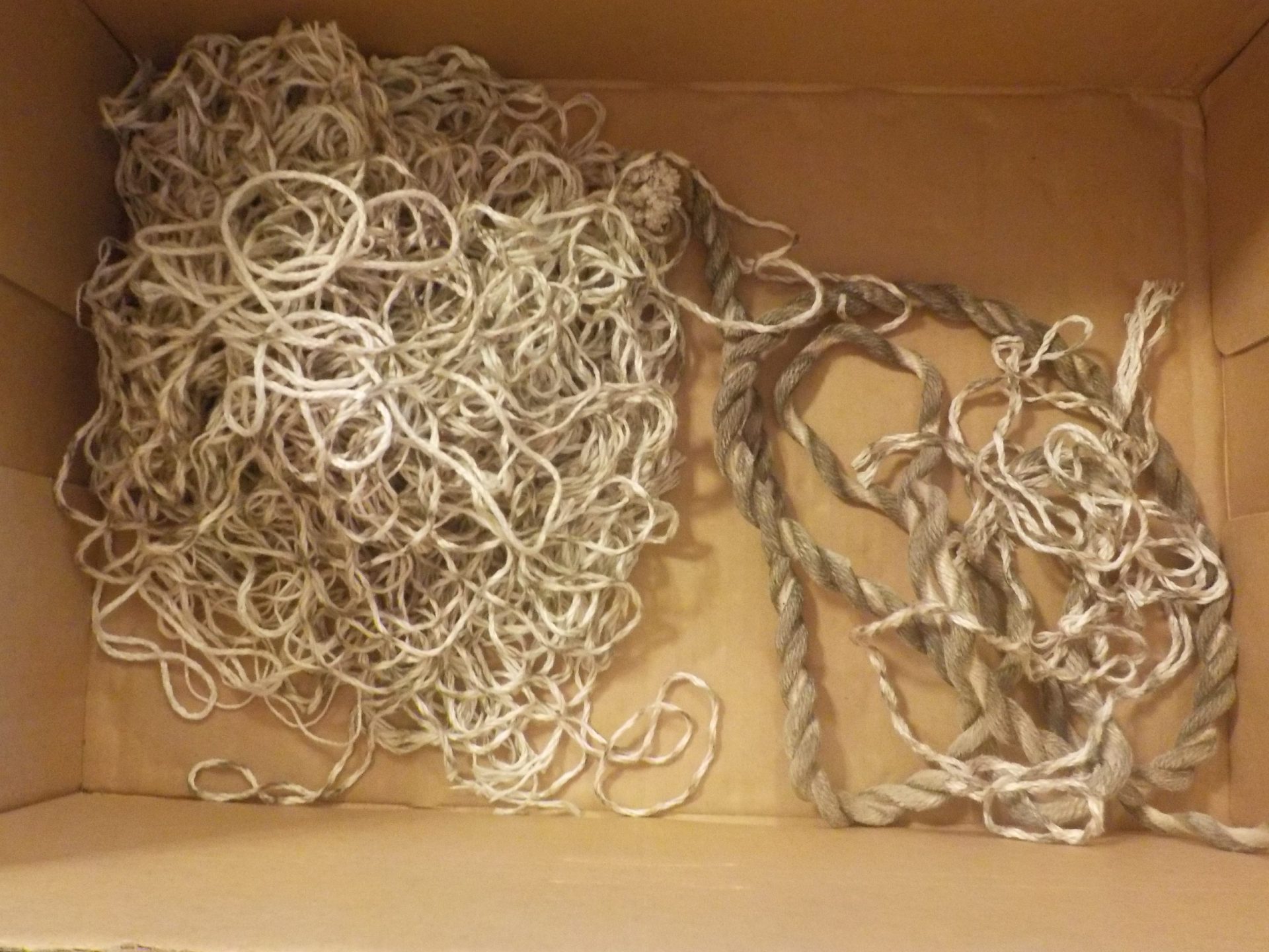 翌日。流しそうめんのあそびがまた発展するようにちょっとだけ大人のアイディアを入れてみました。ロープをほどいてそうめんを作りました。そうめんっぽいでしょ!?