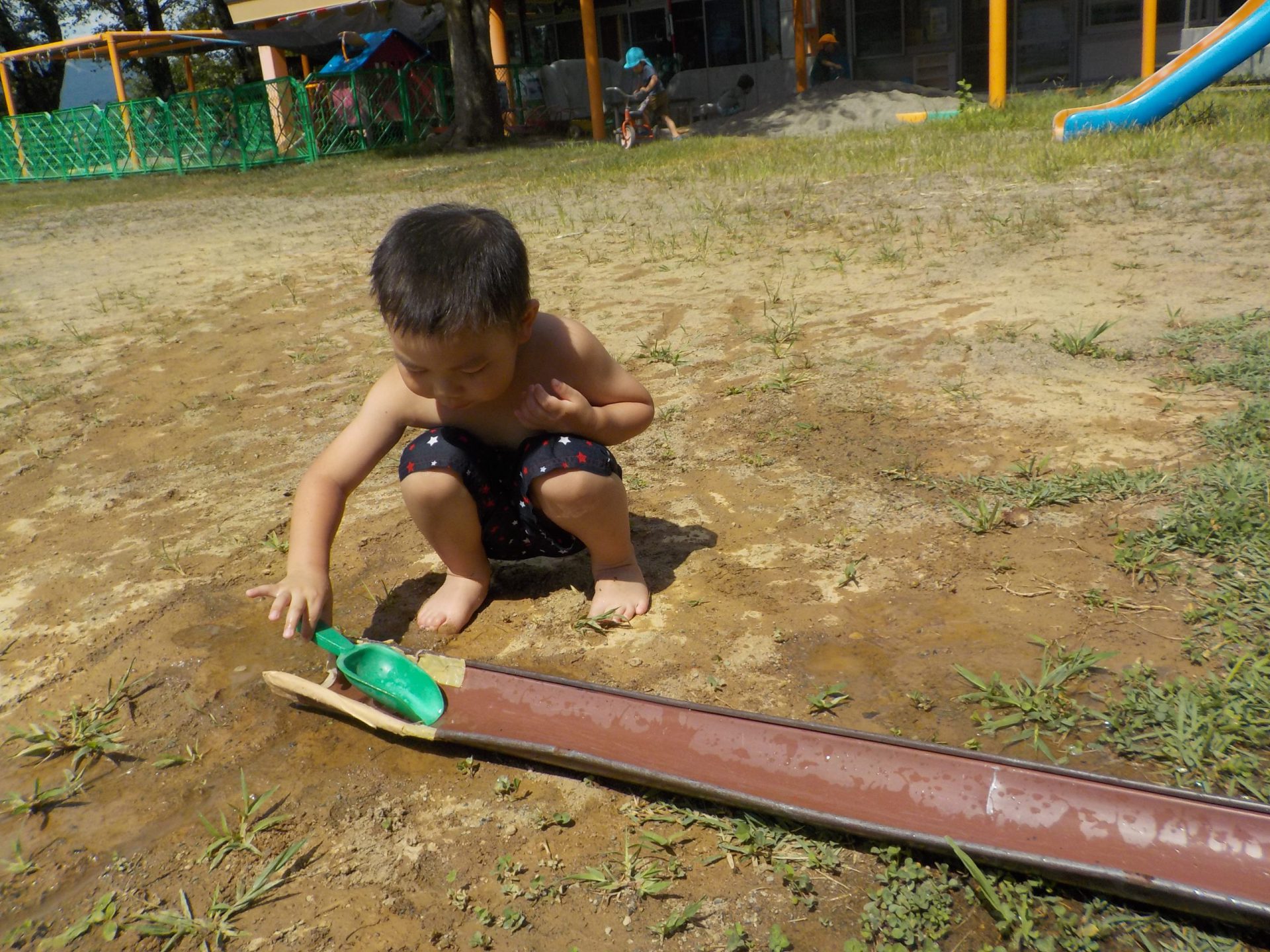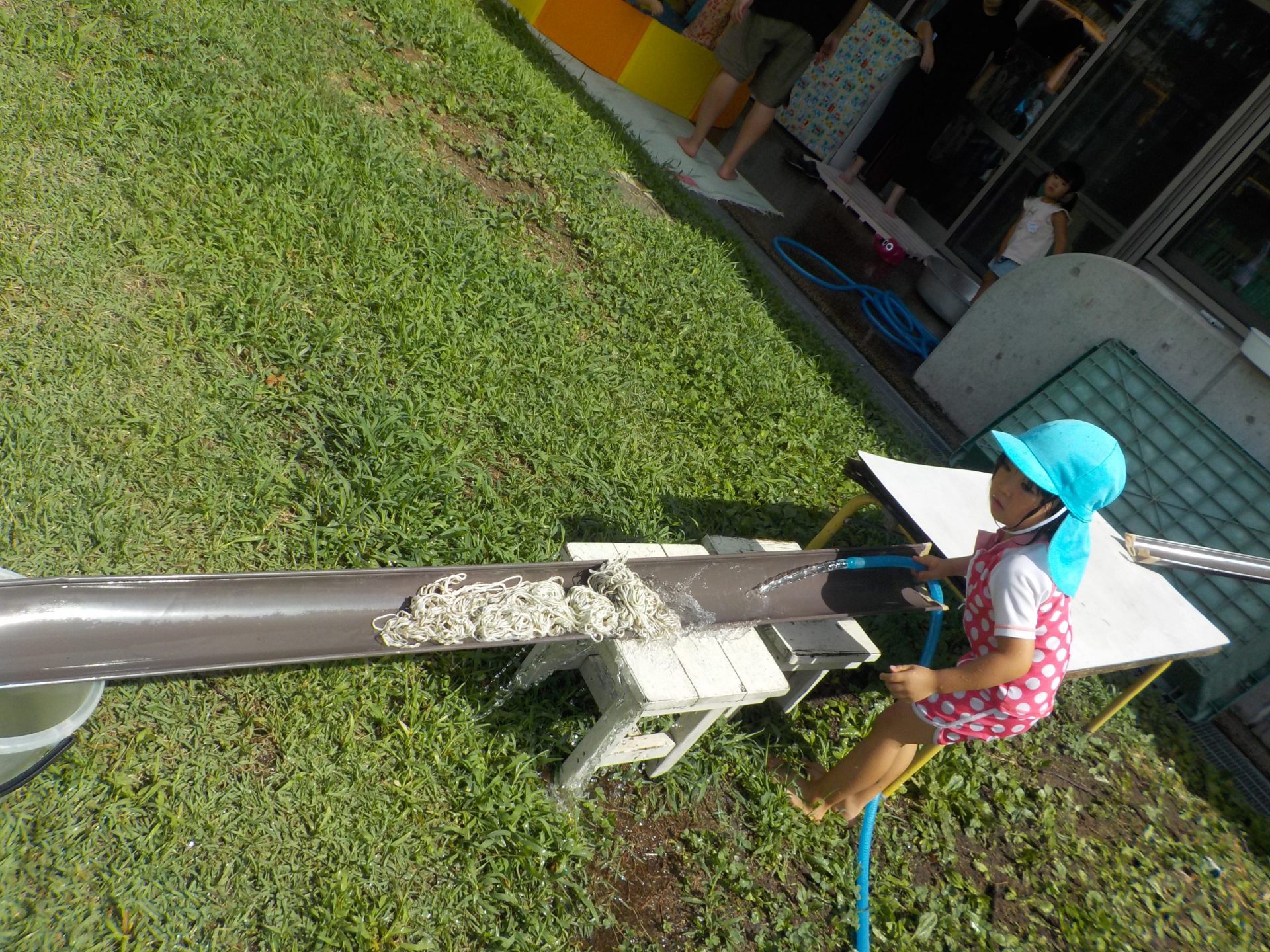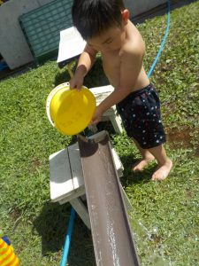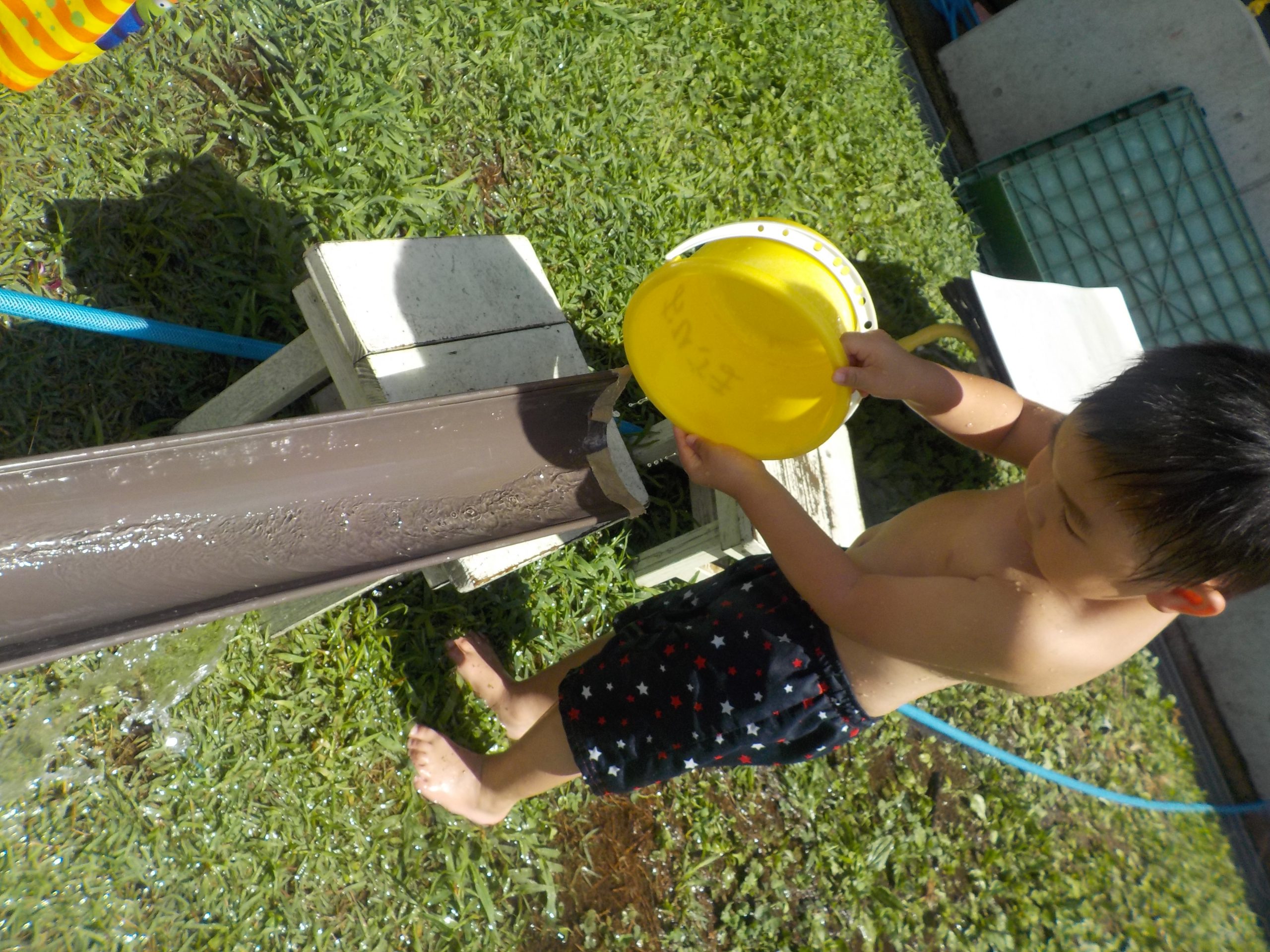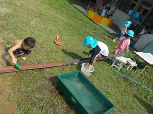何度も崩れてもあきらめません。それぞれにアイディアを伝え合い、試行錯誤の時間。水を流すのが楽しい友だち、樋を完成させたい友だち、水に入りながら見学する友だち、流れてくる水であそぶ友だちと、1つのあそびの中で様々なあそびがあるようです。しかし目的はそうめん流し!!目標を持った友だちはあきらめません。