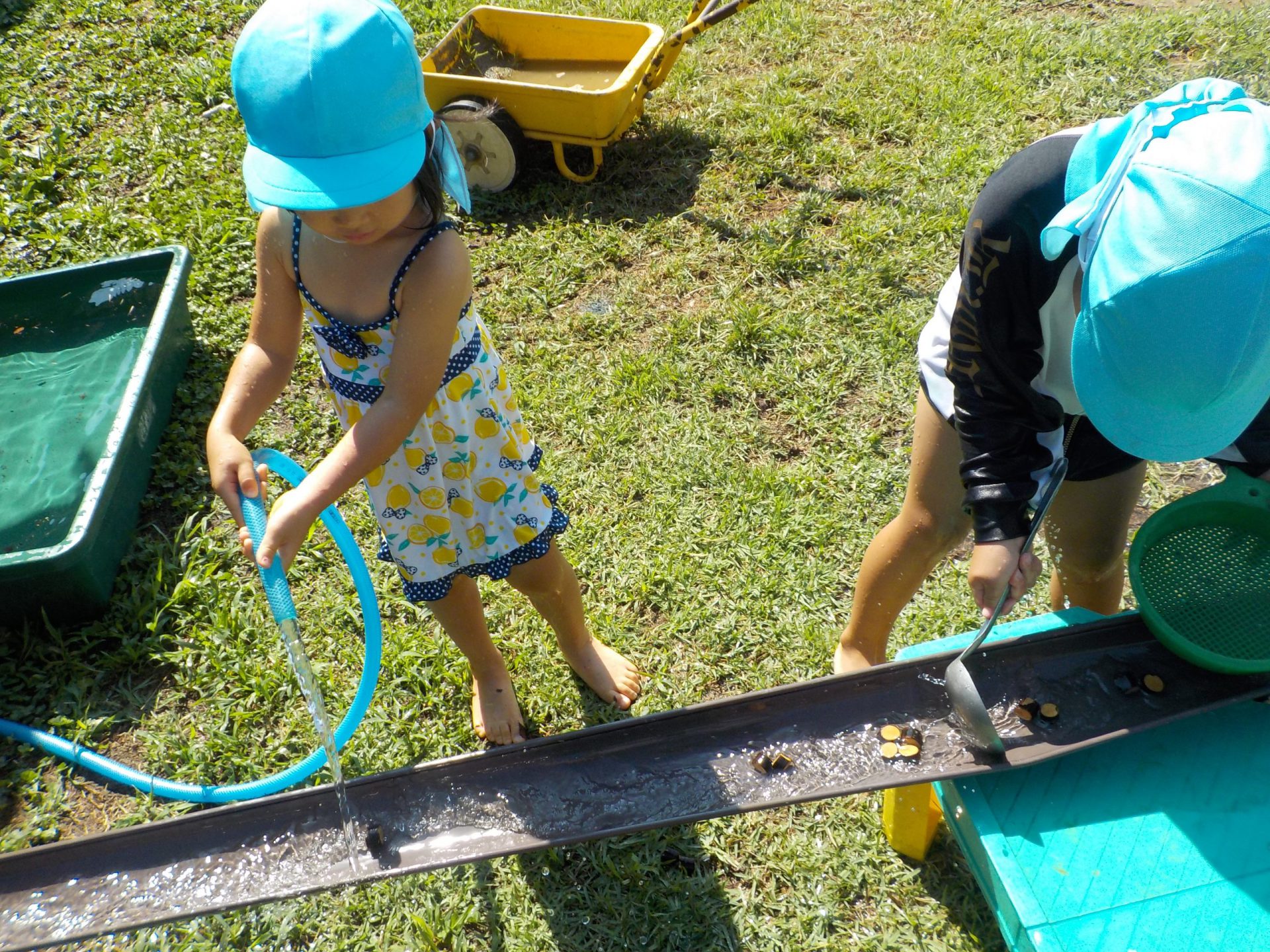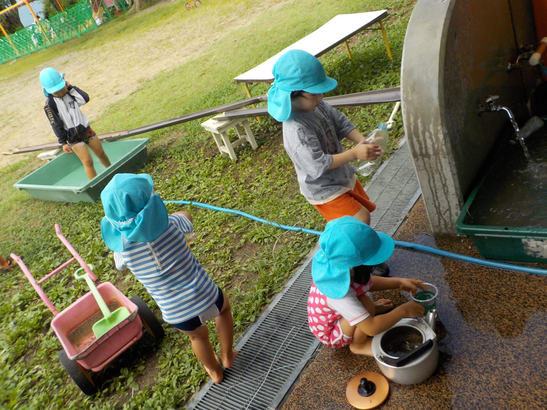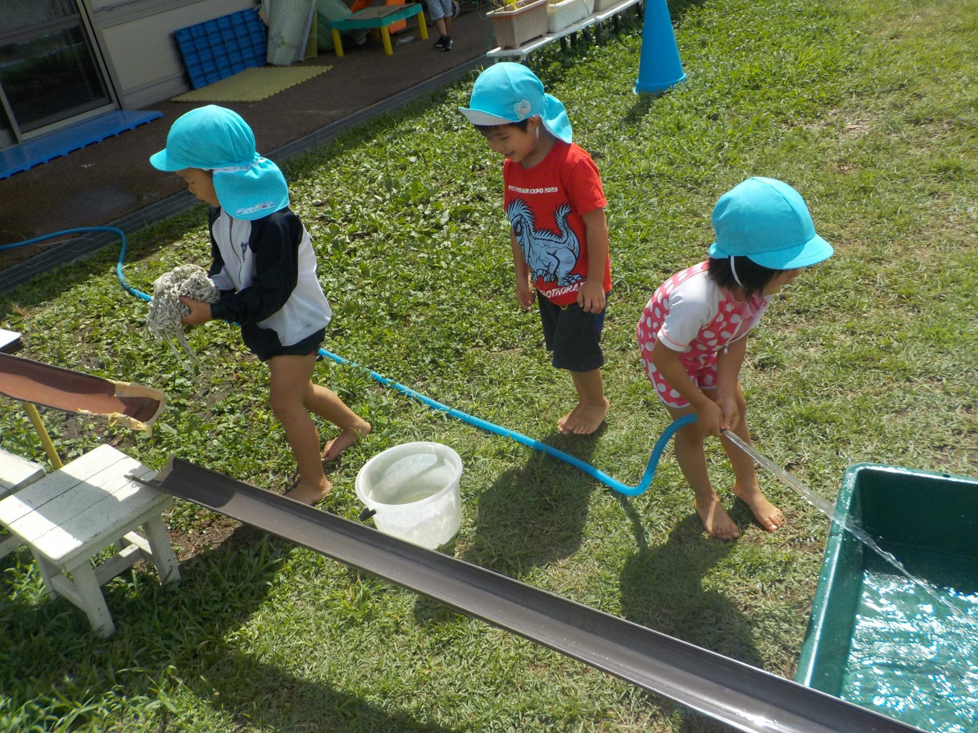 何度も崩れてもあきらめません。それぞれにアイディアを伝え合い、試行錯誤の時間。水を流すのが楽しい友だち、樋を完成させたい友だち、水に入りながら見学する友だち、流れてくる水であそぶ友だちと、1つのあそびの中で様々なあそびがあるようです。しかし目的はそうめん流し!!目標を持った友だちはあきらめません。