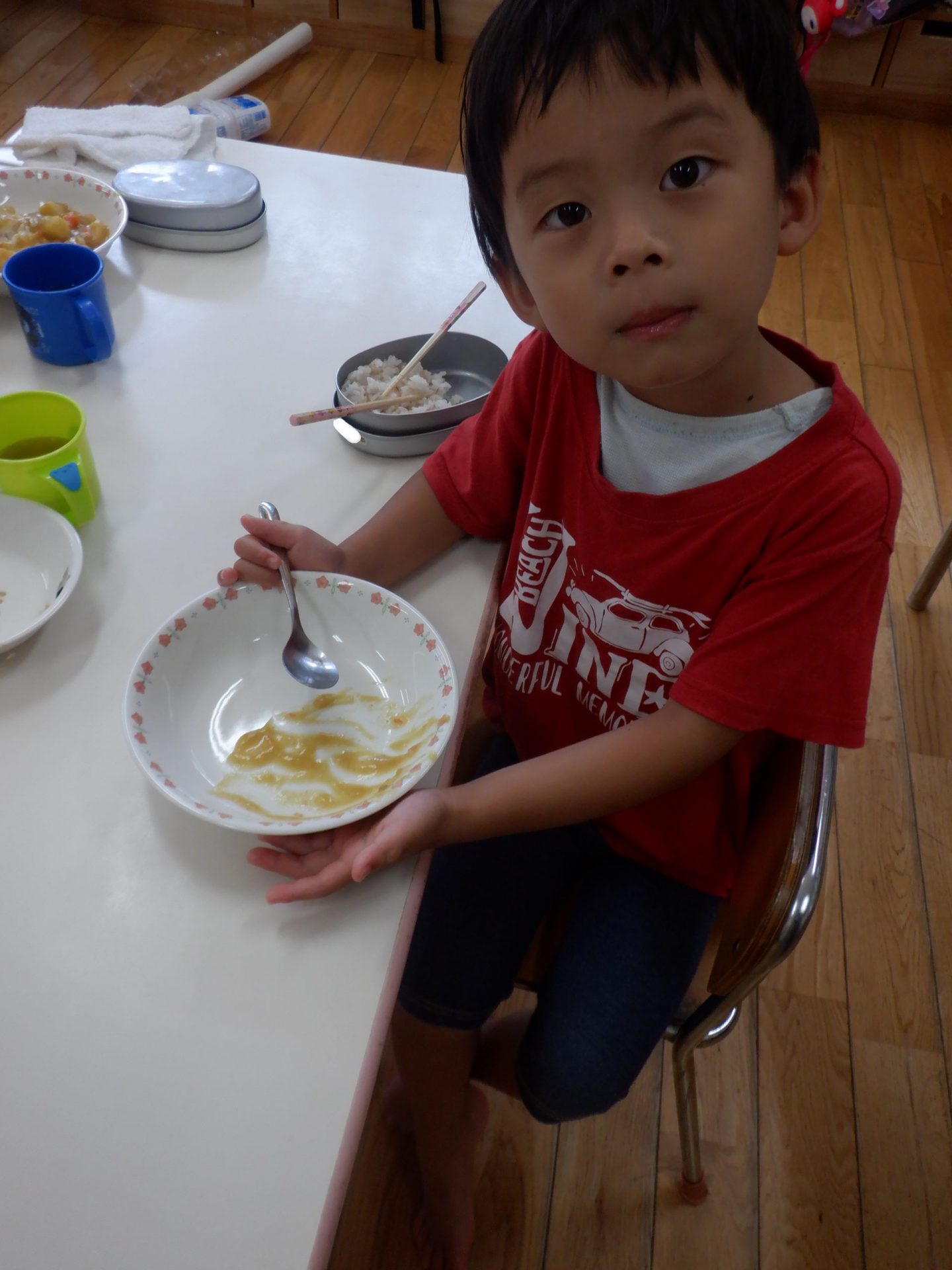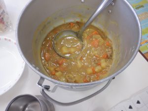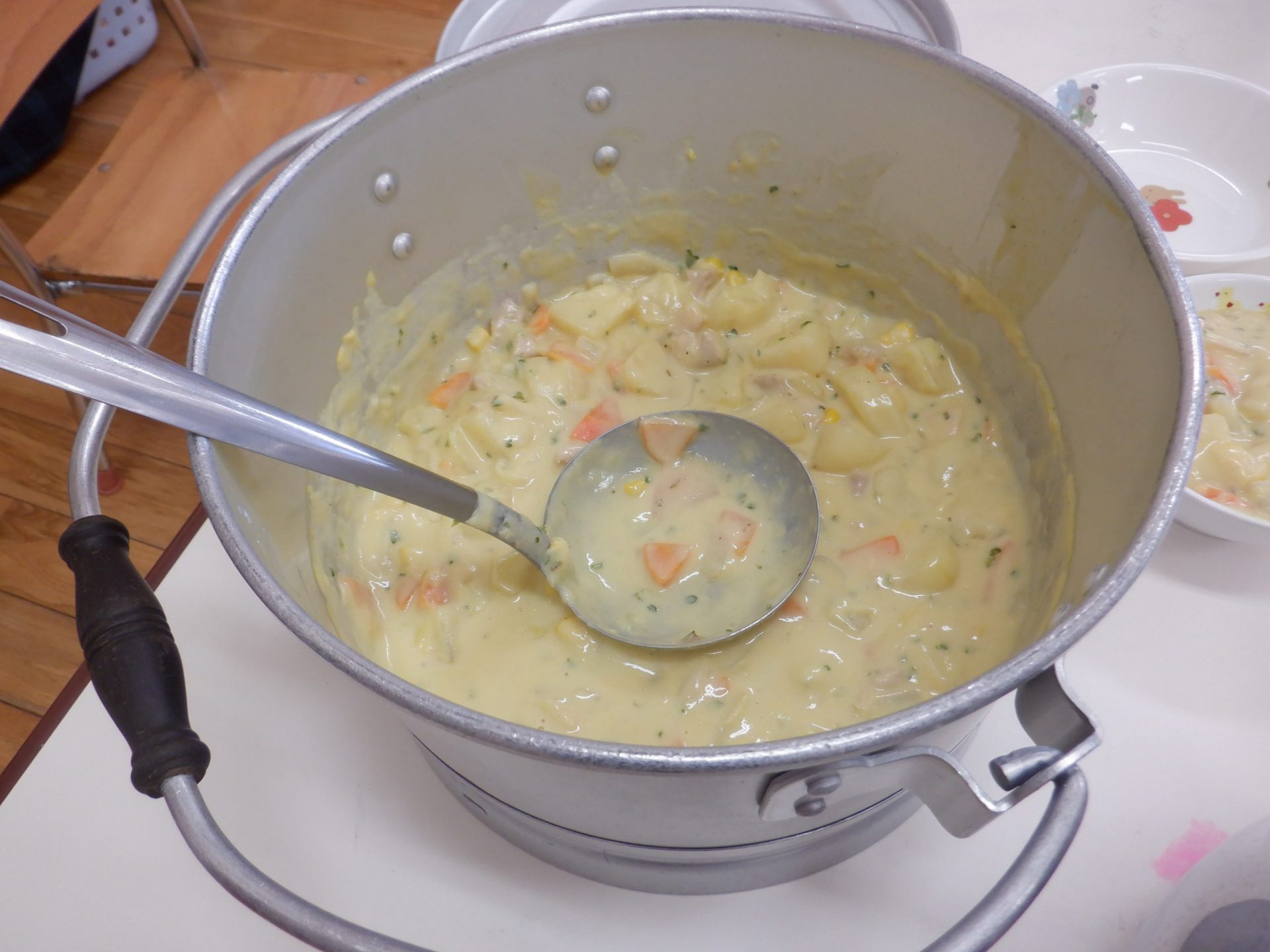 クリームシチューでした!「やった~♡」「これはぼくがみつけたジャガイモだ!」とあっという間に完食。「きゅうしょくせんせいのごはん、おいしい!」それは一番の誉め言葉だね!