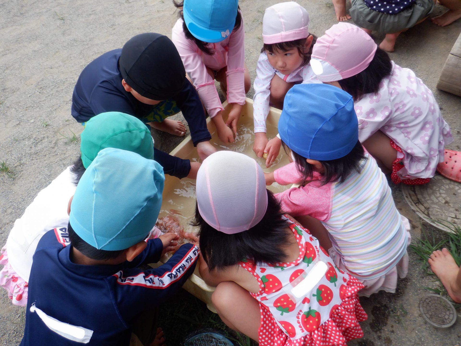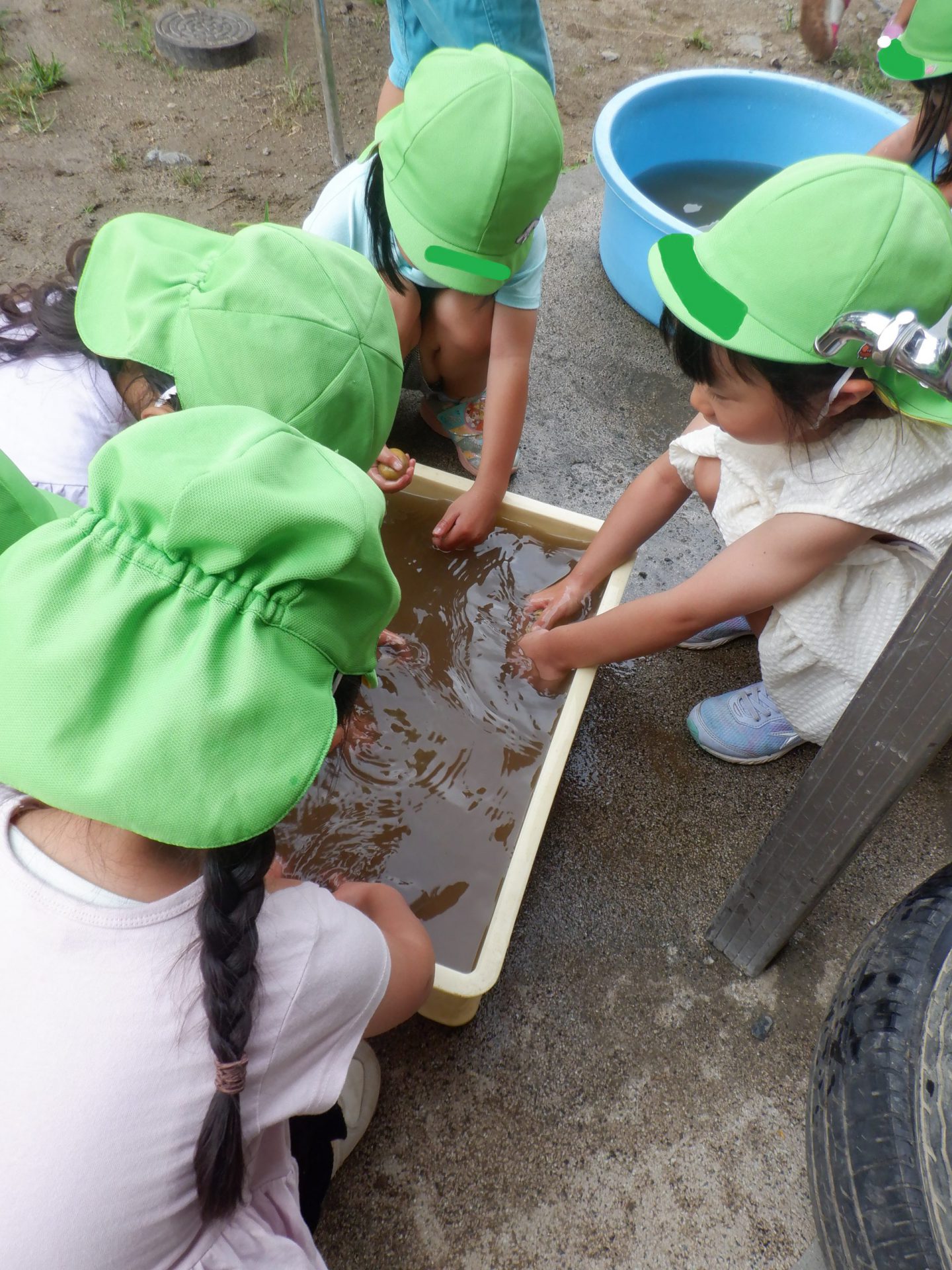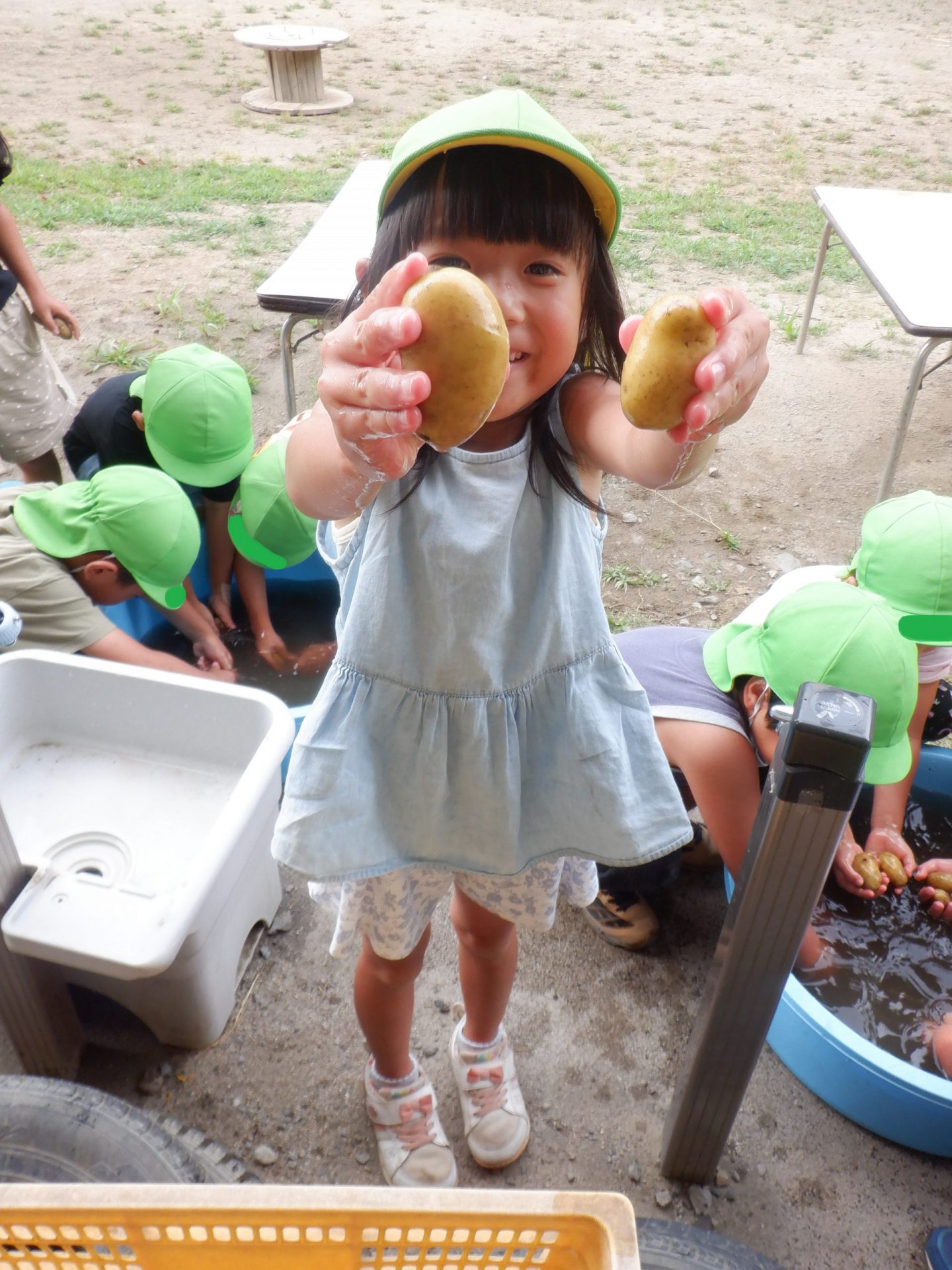 しばらく園で置いておいたジャガイモ。いよいよ料理に使うという事で、年中さんが懸命に洗っております。「なんのりょうりになるのかな?」「カレーじゃない?」「じゃがバターだよ!」会話が弾みます。