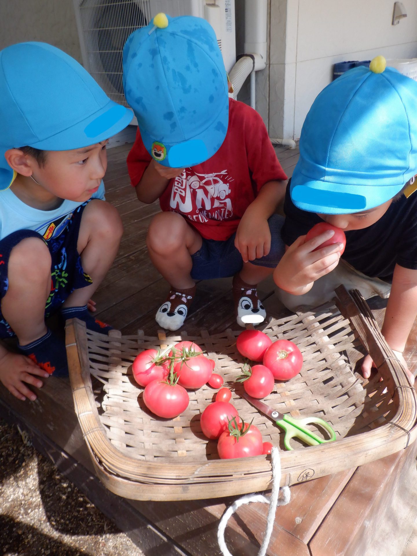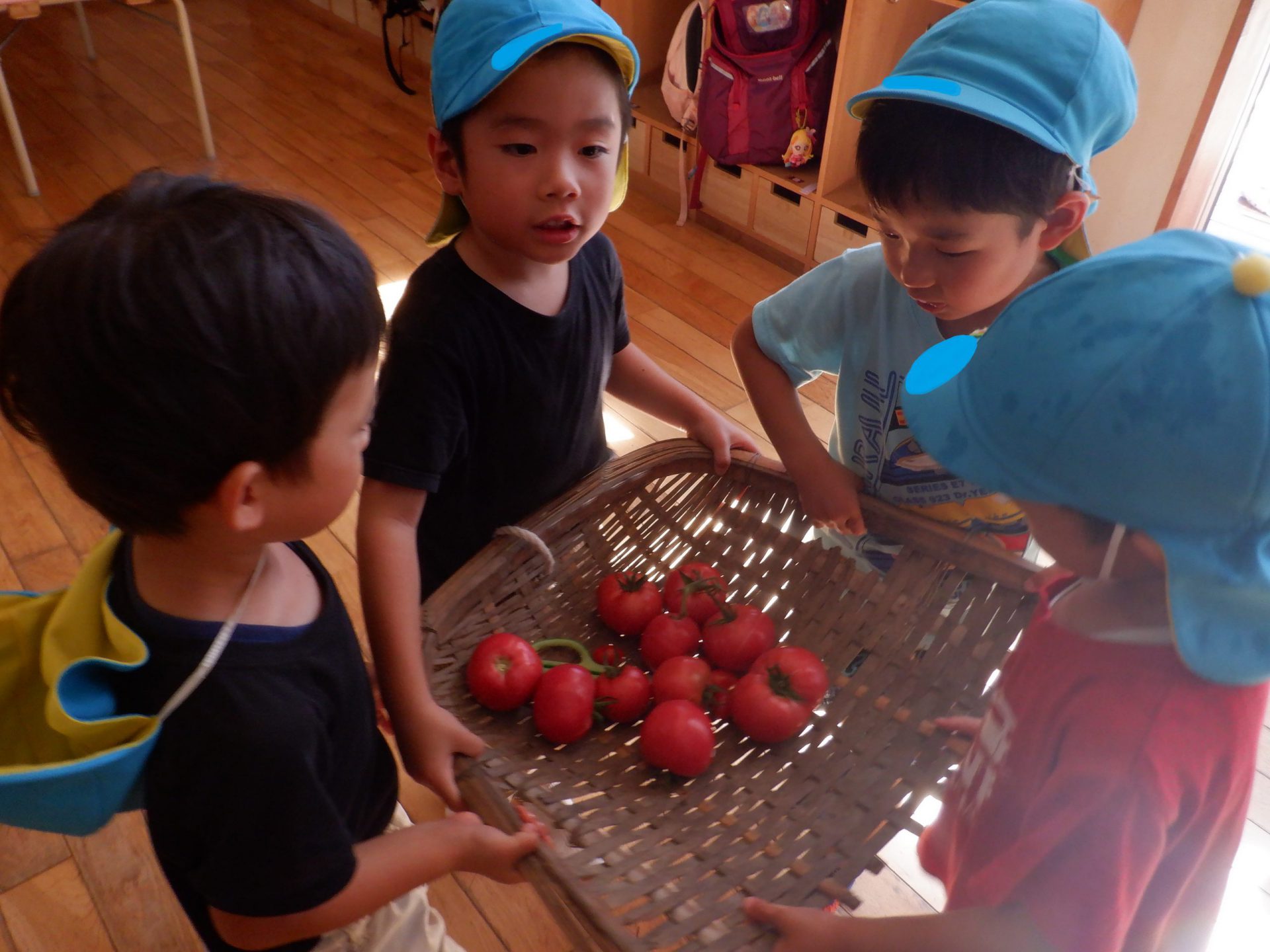 特製カレーの材料になりました!「トマトのあじがしない!」と不思議がる年中さん。「これならたべられる」とトマトが苦手な子も自然の恵みをいただけました。