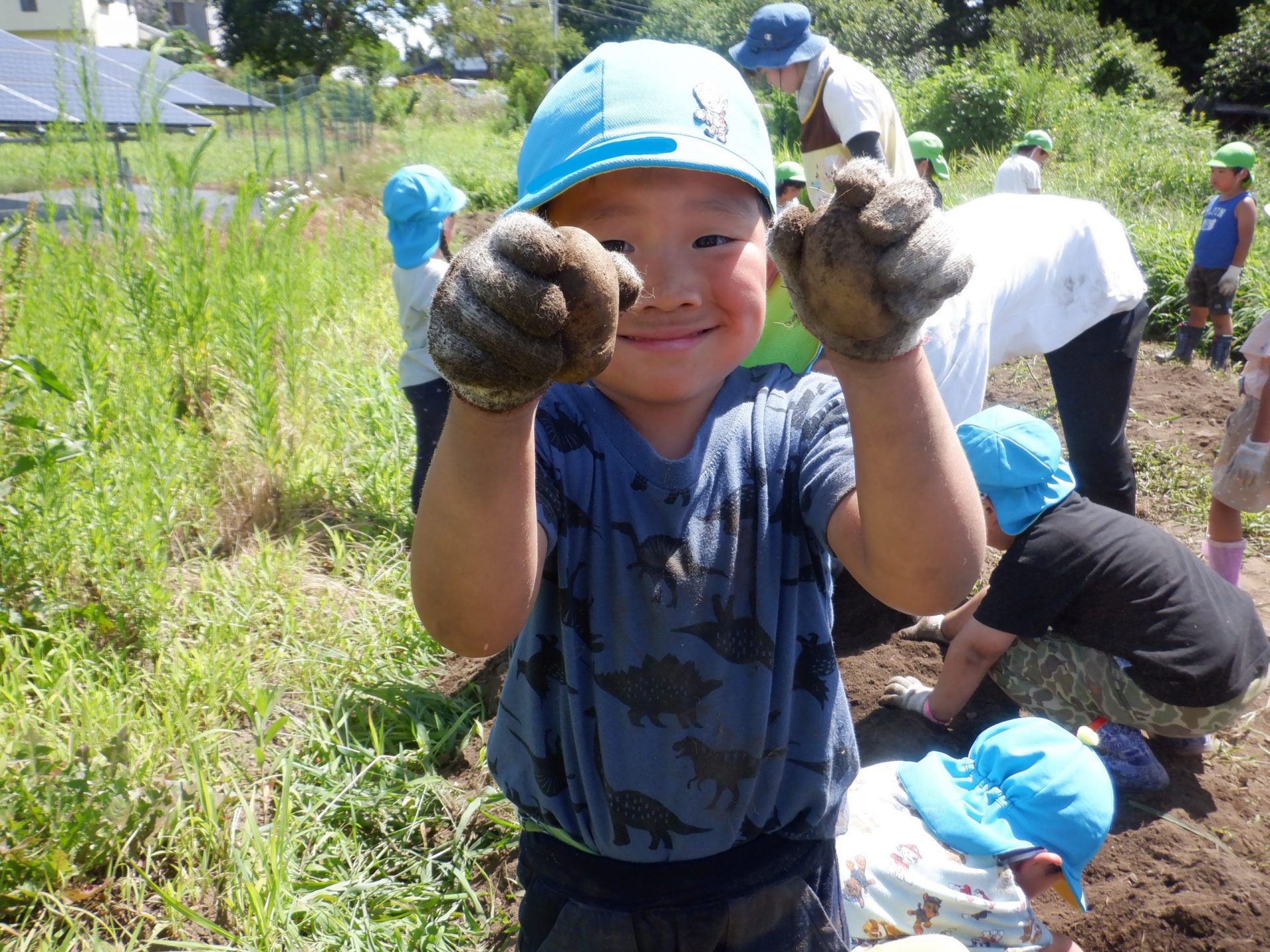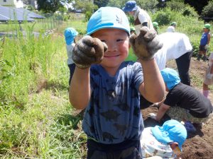 顔が汚れても平気平気!一生懸命掘り起こしたいい顔で、見せてくれました。「みてみて!かわいいおいもだよ!」確かに今回は小ぶりなお芋です。よく見ているな~。