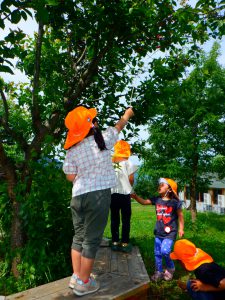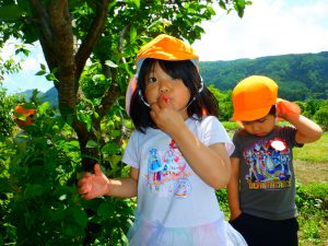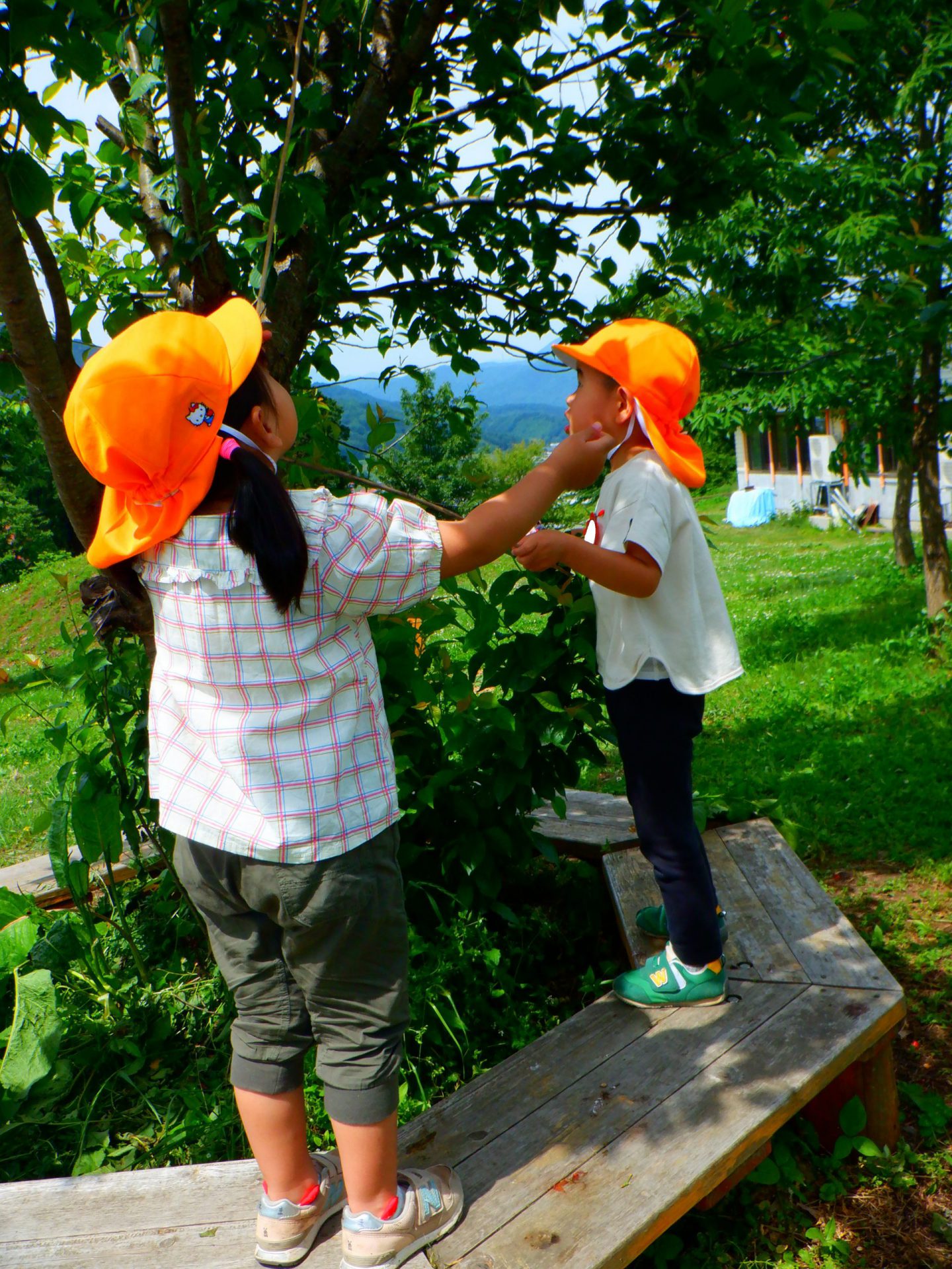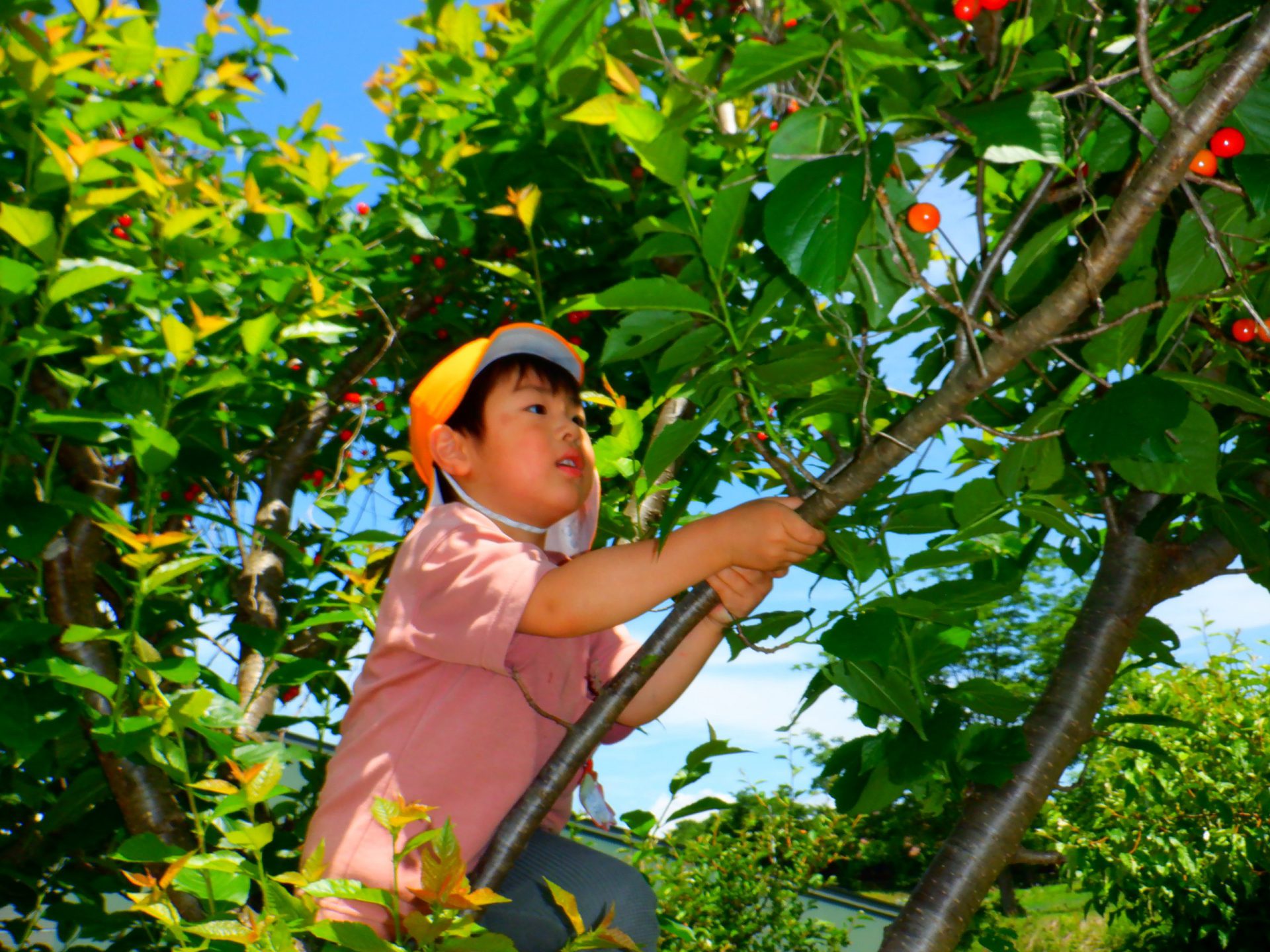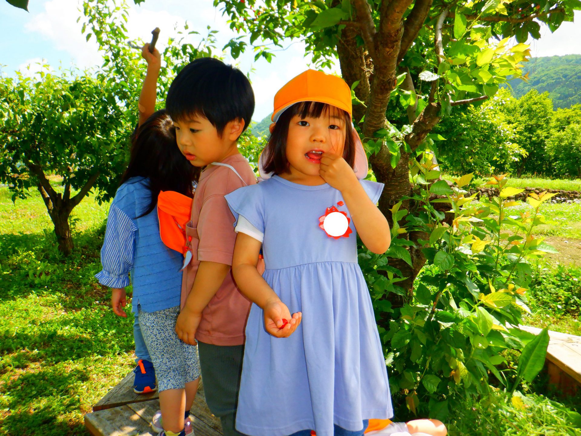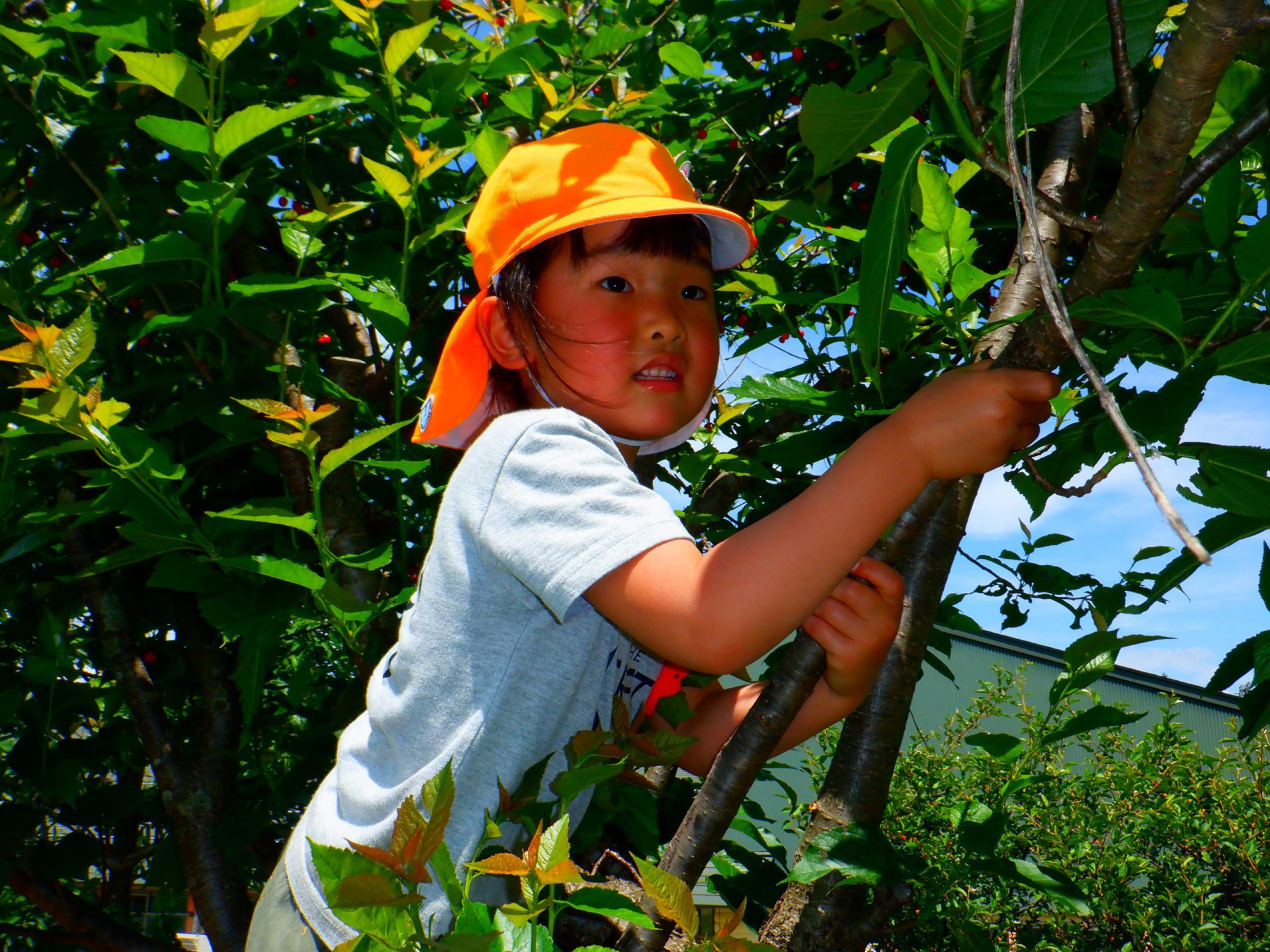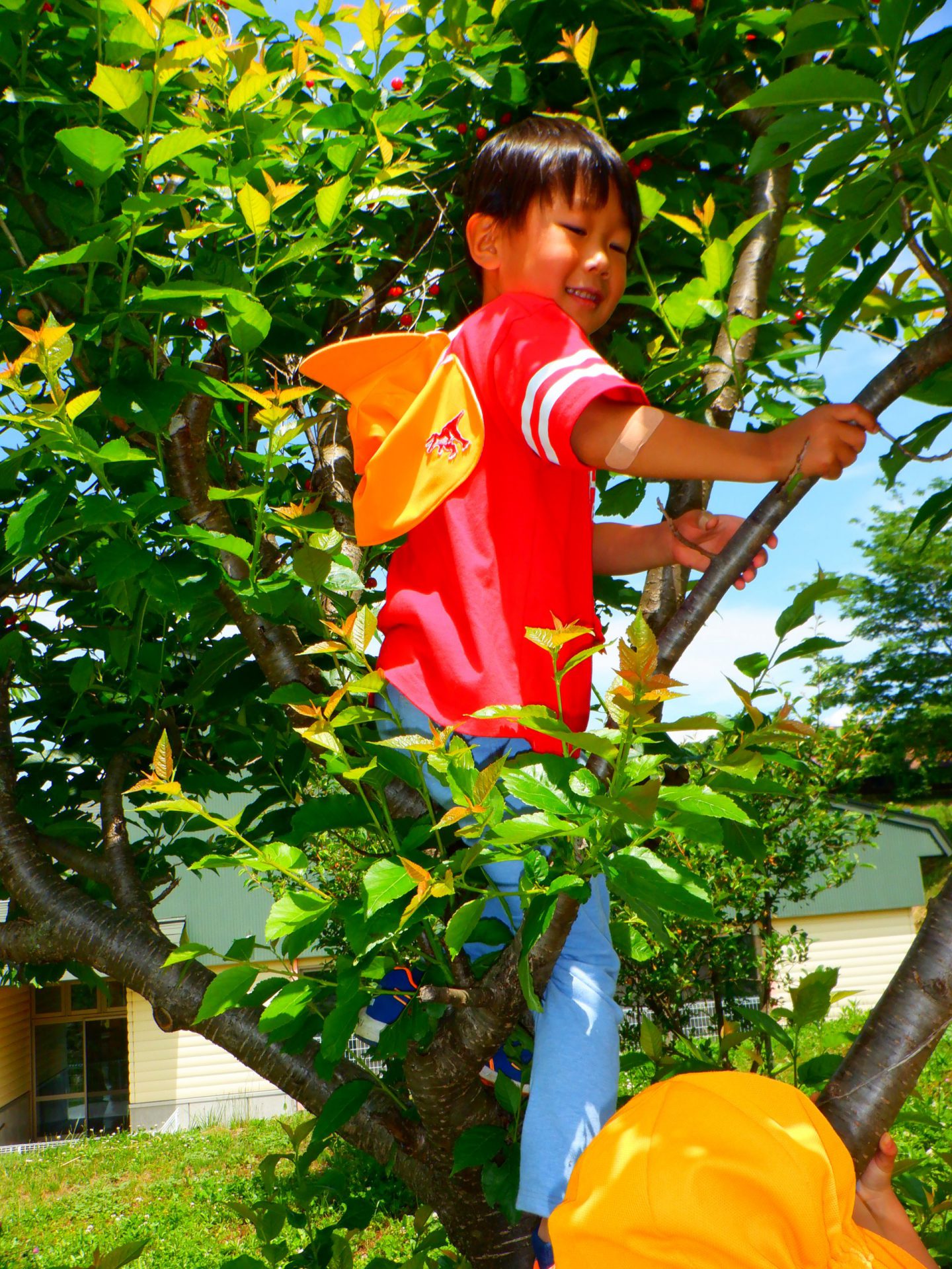 年中さんも外遊びの合間に、最初は地面から手の届く高さのサクランボを食べていきます。