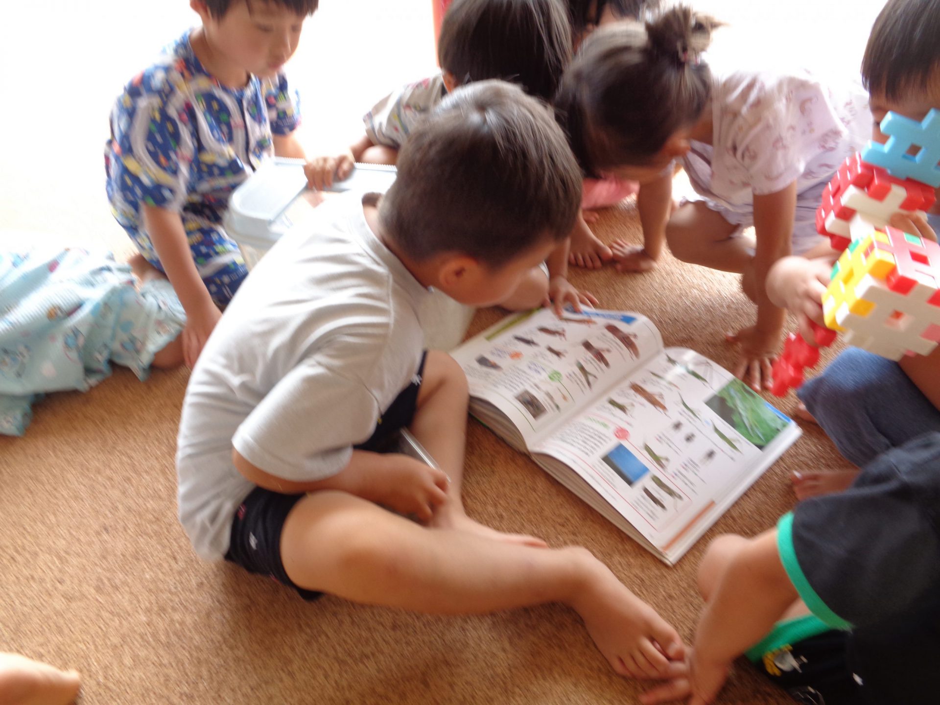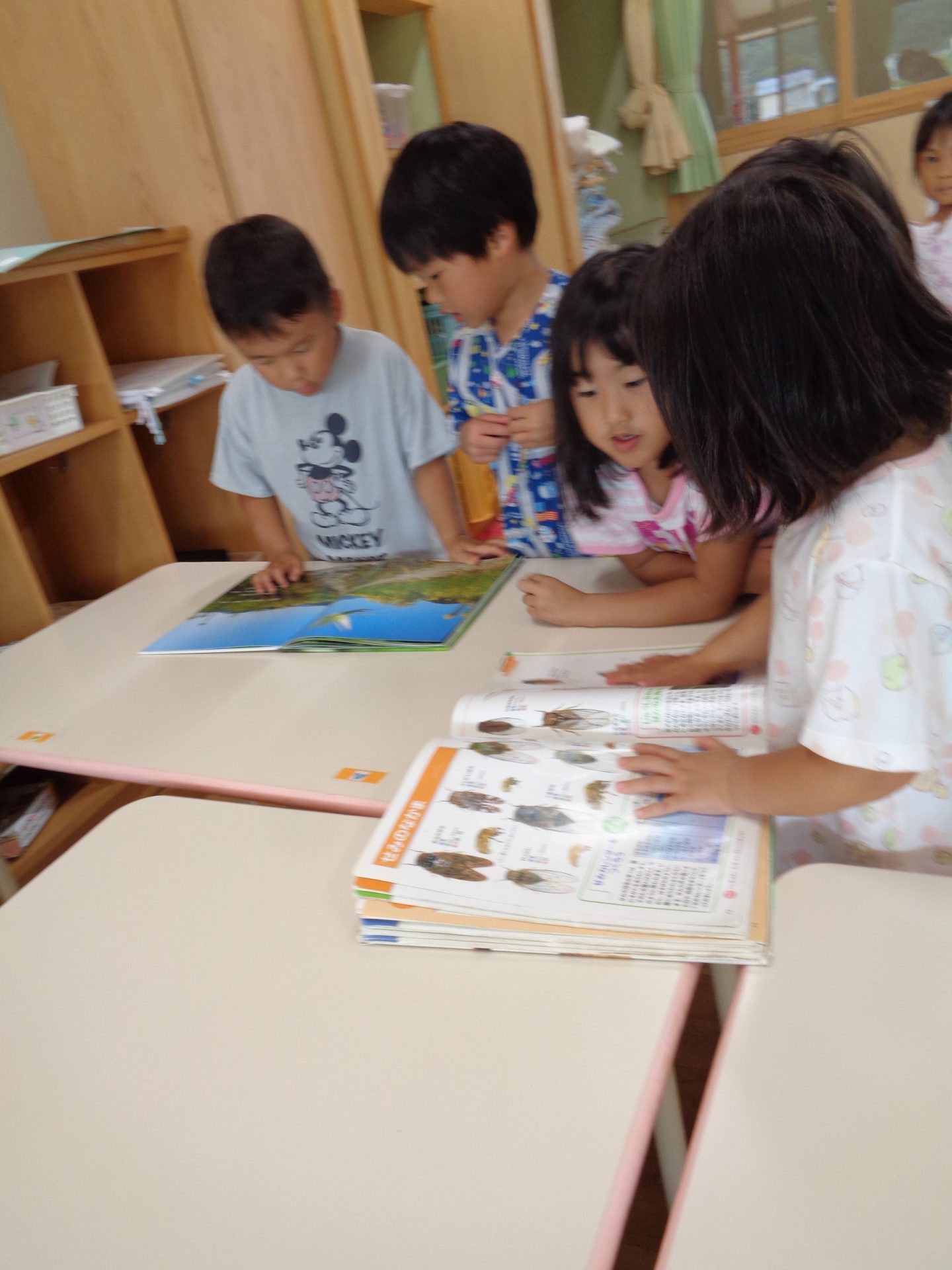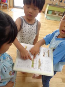 年長さんのクラスから図鑑を借りてきて“この虫はなんていう虫なんだろう?”と悩み中。