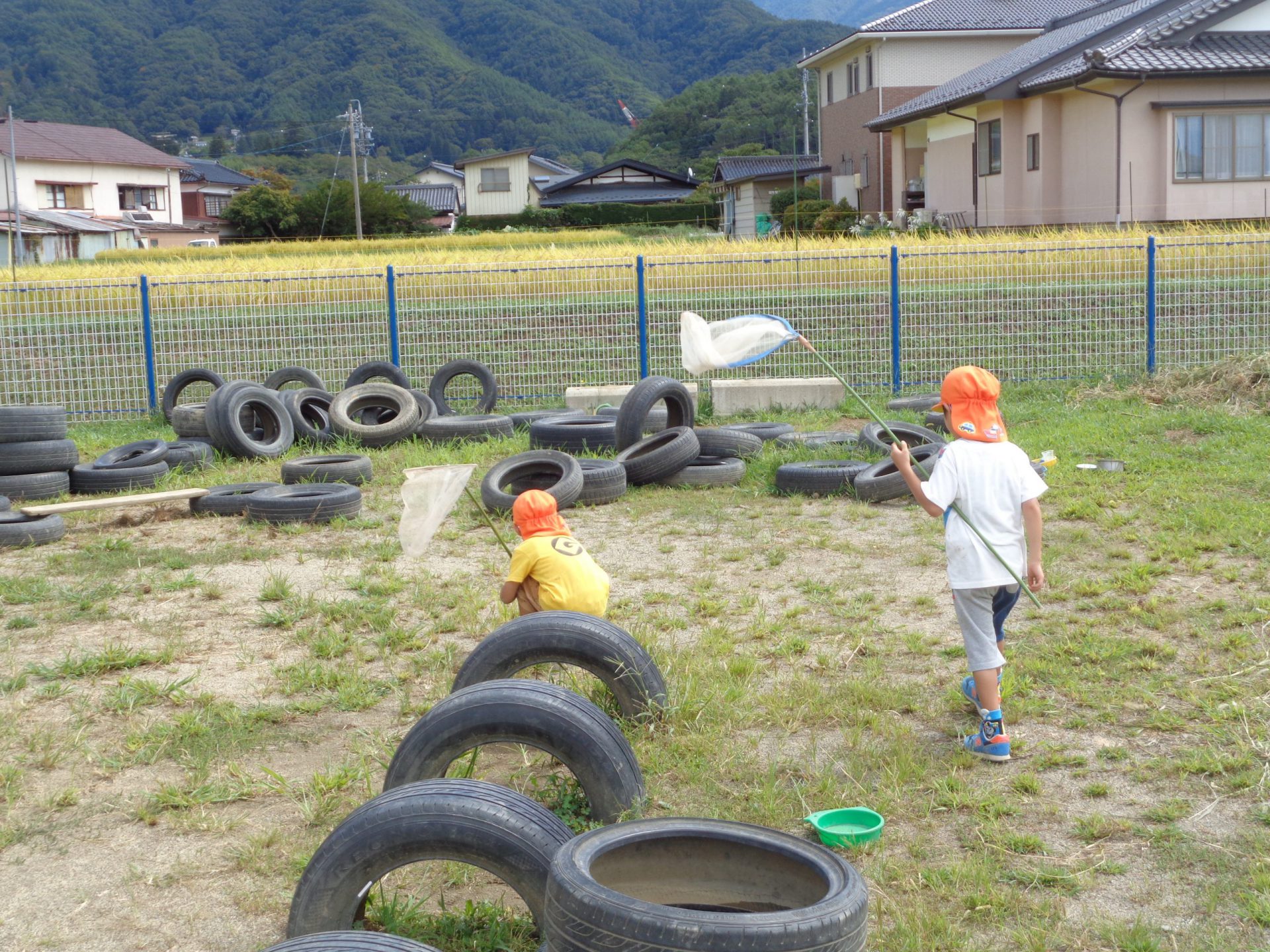 園庭には季節でいろいろな虫たちがやってきます。秋の風が吹くようになってきた今は空にはたくさんのトンボ、草の近くでは田んぼからやってきたバッタなどが多くみられる季節になってきました。