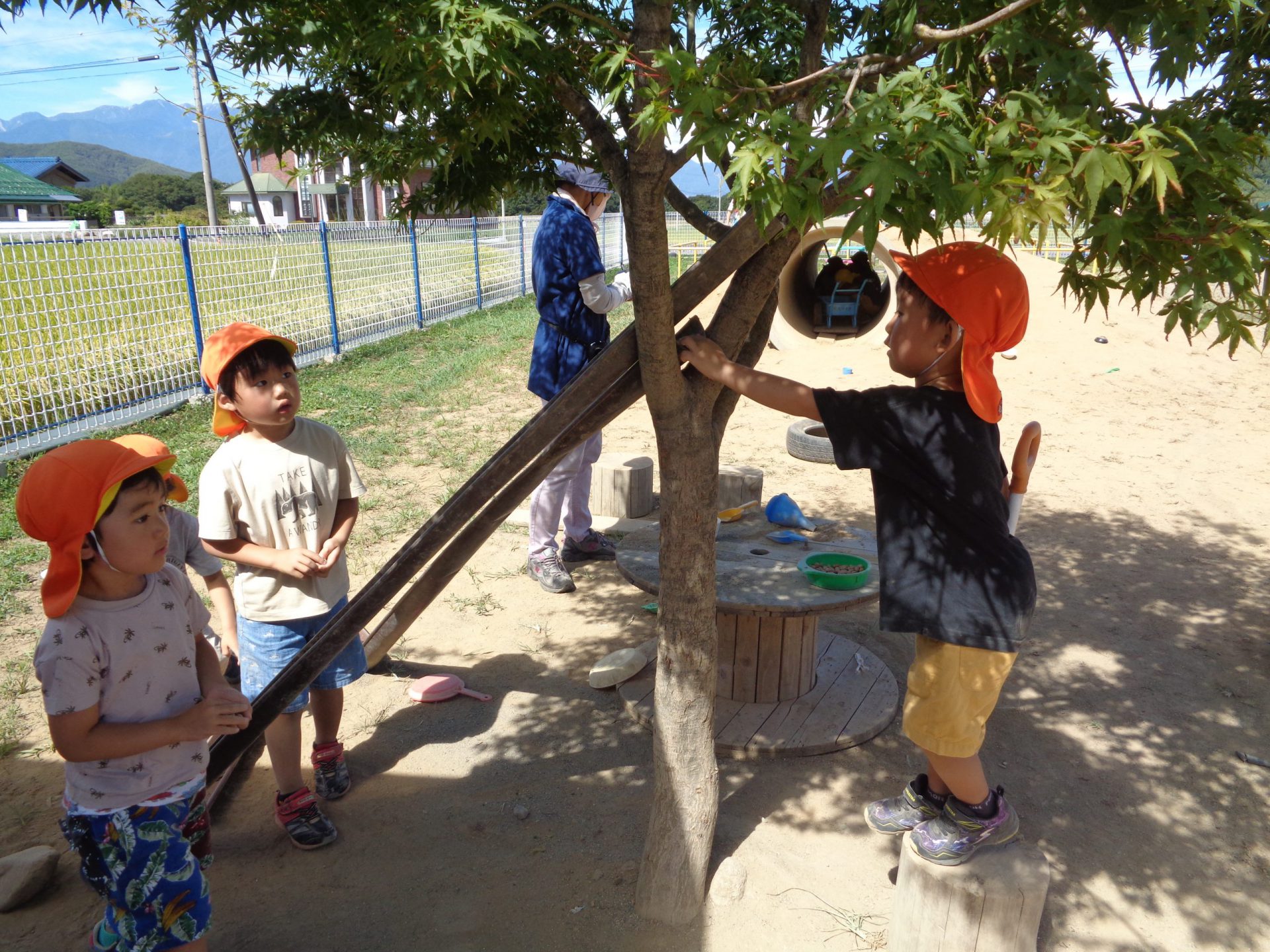 こちらは年中さん。もっと早く転がしたい!じゃあ高くすればいいんじゃない?と塩ビ管を木に立てかけて転がりを調節。跳ねて塩ビ管から出てしまうほどの猛スピードで転がるどんぐりに「すっげ!」「早すぎて見えなかったね!」とこちらも夢中で楽しんでいました。