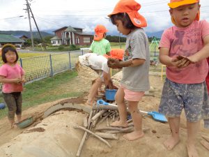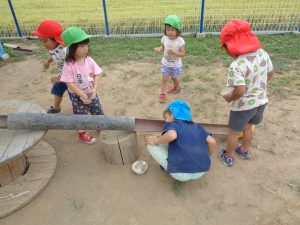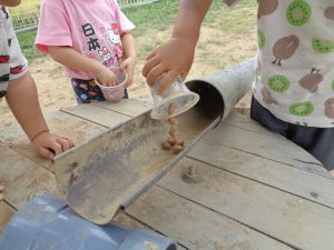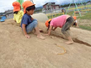 赤土山では泥んこ遊びの時に楽しんだ泥んこ滑り台を楽しんだり、その時にできた溝にボールを転がしてスライダーを楽しんでいます。