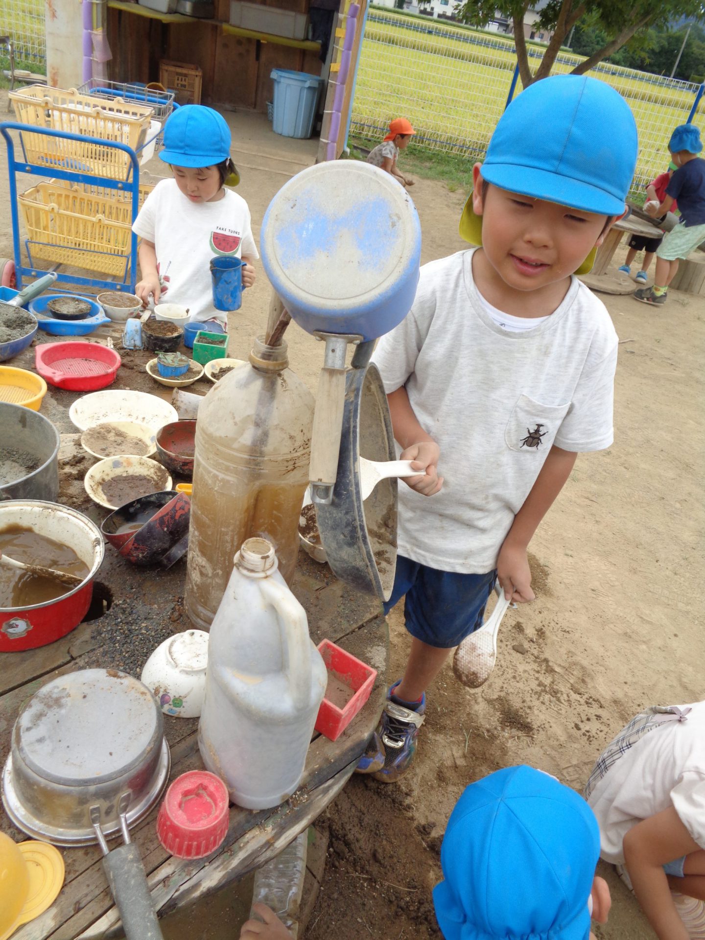 こちらは年長さん!ケーブルドラムの上にたくさんお皿やお鍋が並んでいます。