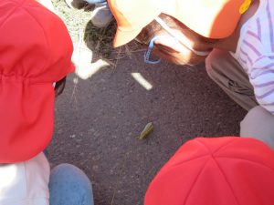 散歩の途中、何かを発見した子どもたち。 「これ、なんだろう?」「アゲハ蝶の幼虫だよ」「動いた!」「かわいい~!」しばらく観察。