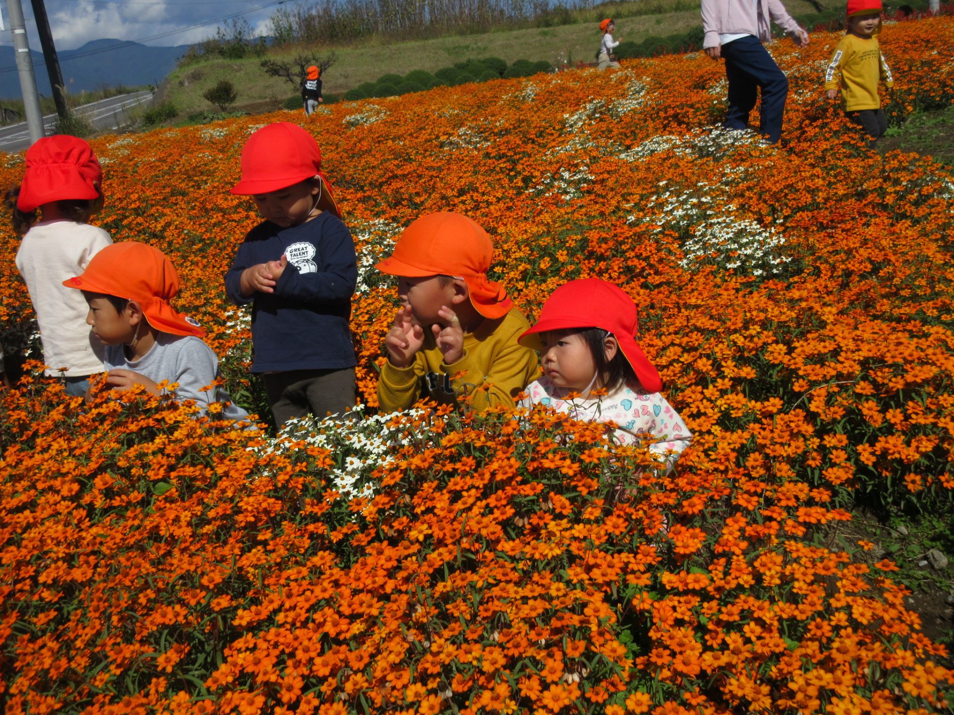 お花畑に着きました。ジニヤの花がいっぱいの中でしばらく遊びました。