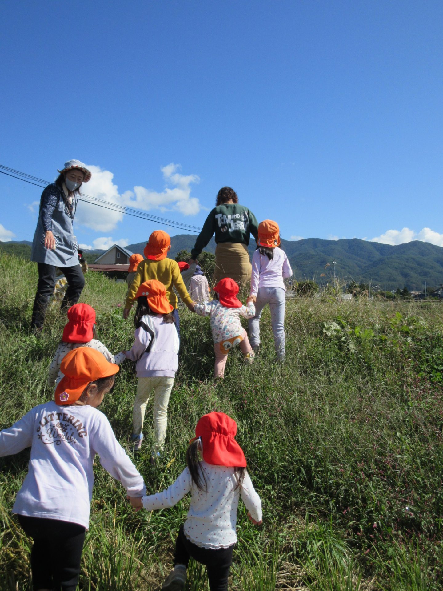 「チャコちゃんに会いに行こう!」 田んぼのあぜ道を歩きます。5歳児が2歳児を連れてゆっくり歩きます。「ここ、気を付けてね」