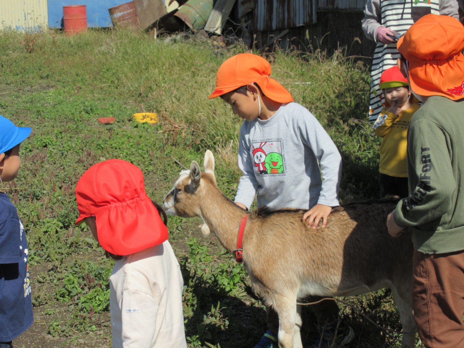 「チャコちゃん、いたー!」ヤギのチャコちゃんと触れ合って遊びました。 「これ食べて」 草をあげる子ども達。 「チャコちゃん、かわいいね!」