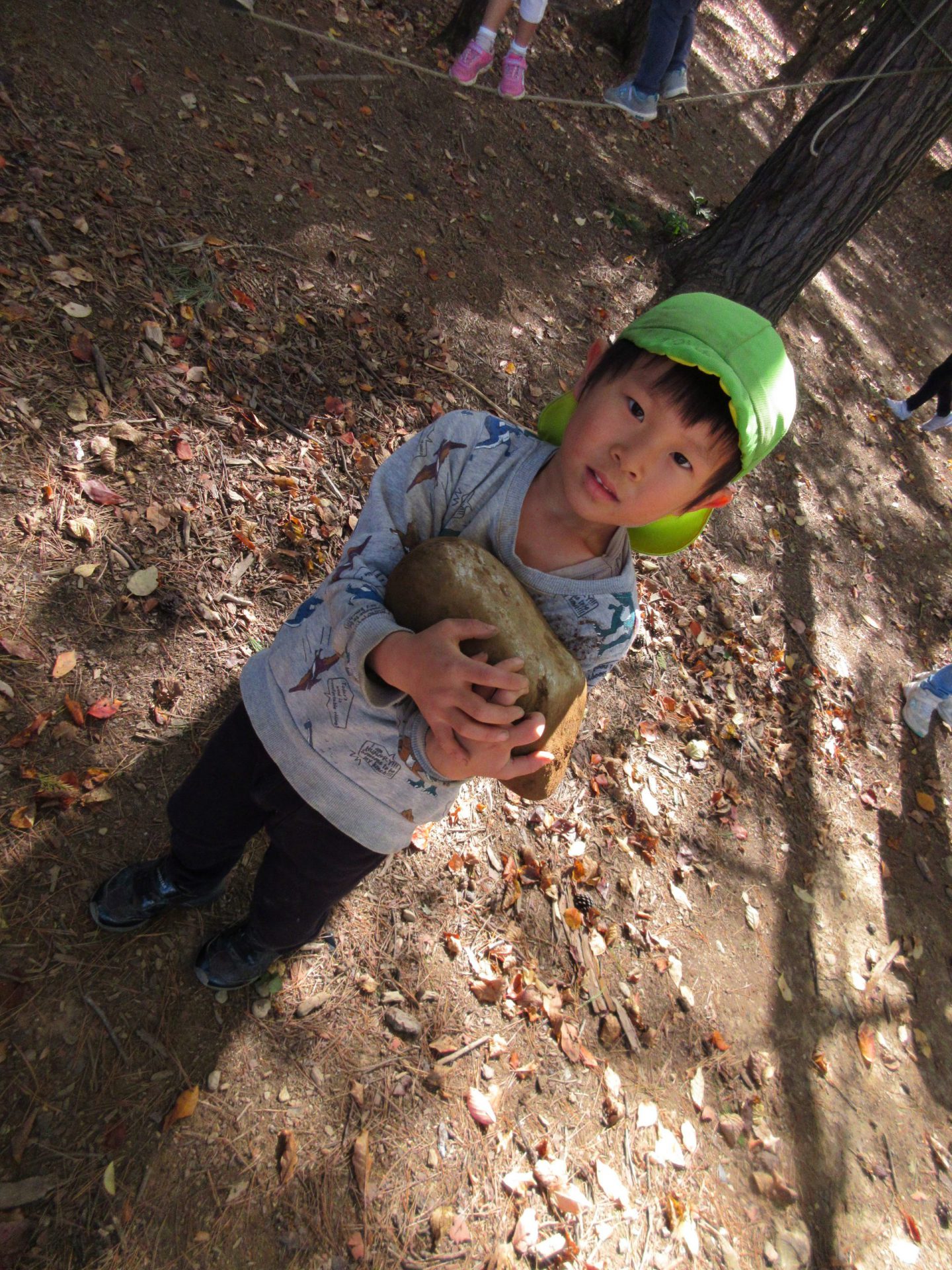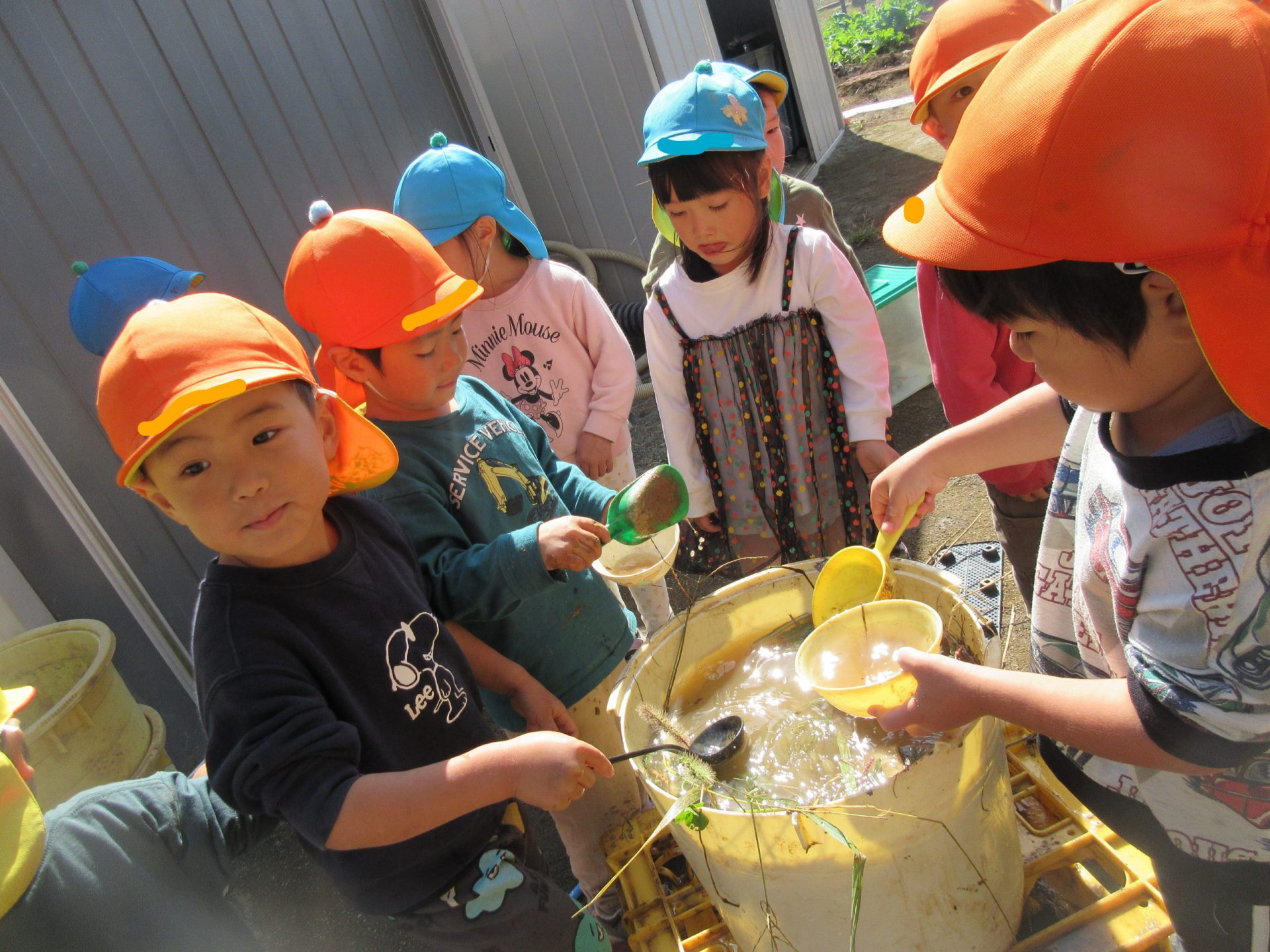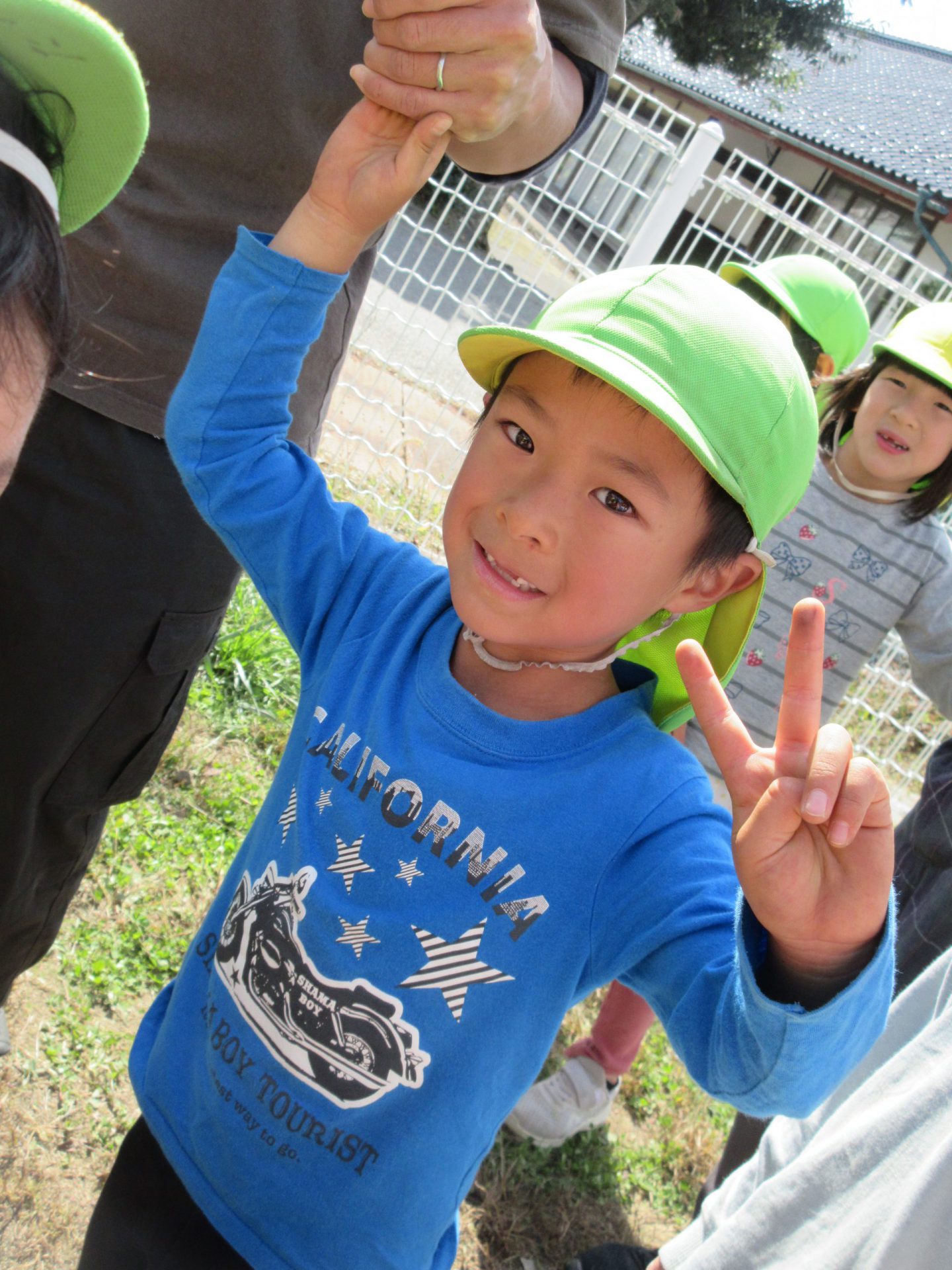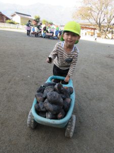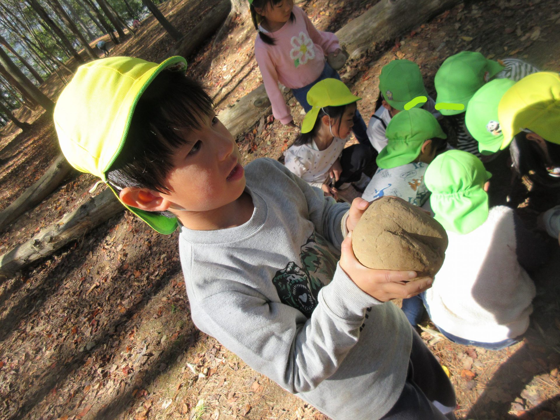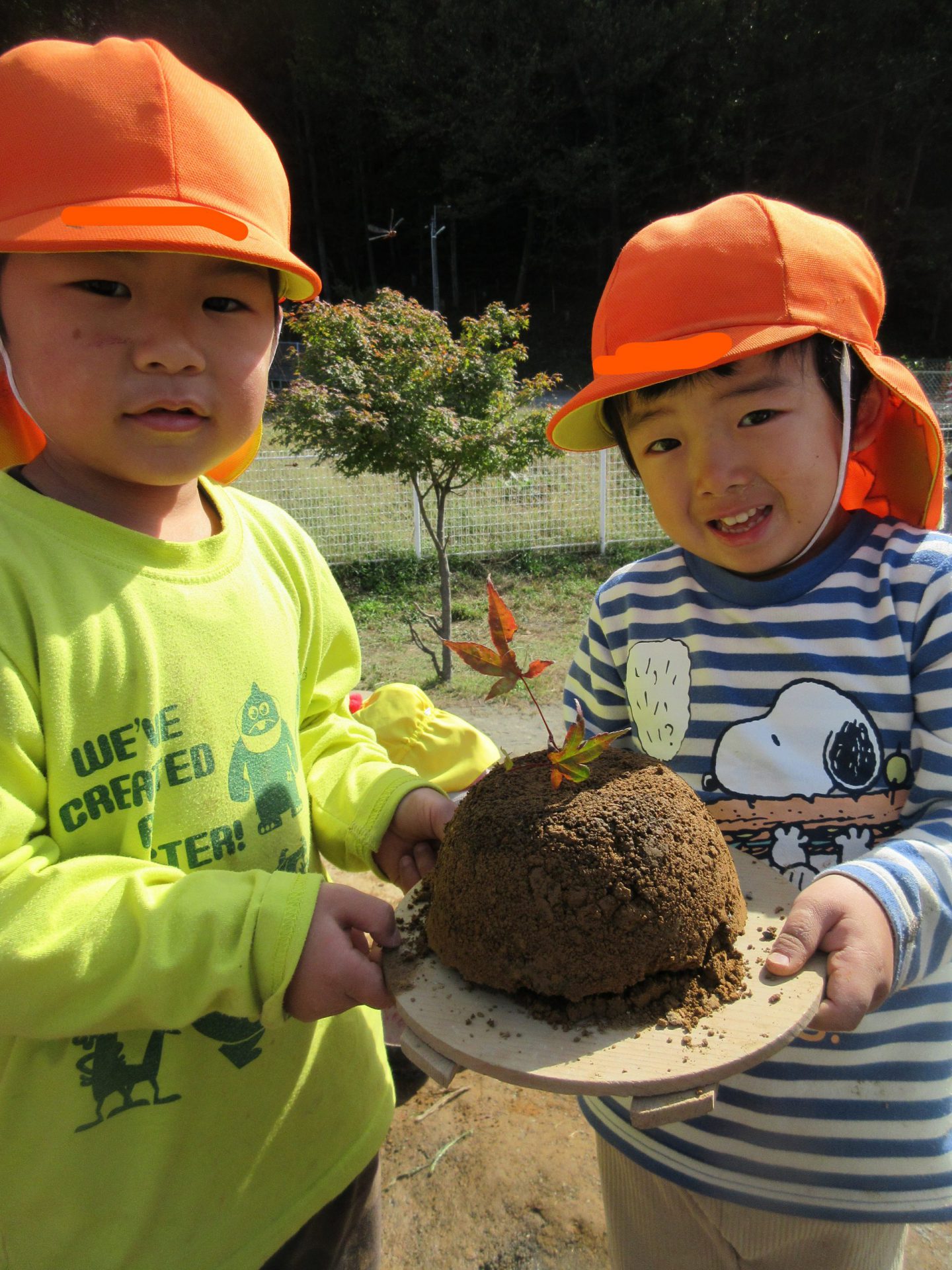 気の優しいS君は思わず自分から顔をだしました。 「すご~い」一生懸命探していた子ども達からの歓声が! よく考えたね!庭でお家の方に作っていただいた🍙と共に美味しいさつま汁をたくさん食べました。普段はコンニャクを食べない子も 自分のちぎったコンニャクを探しながらよく食べたそうです。