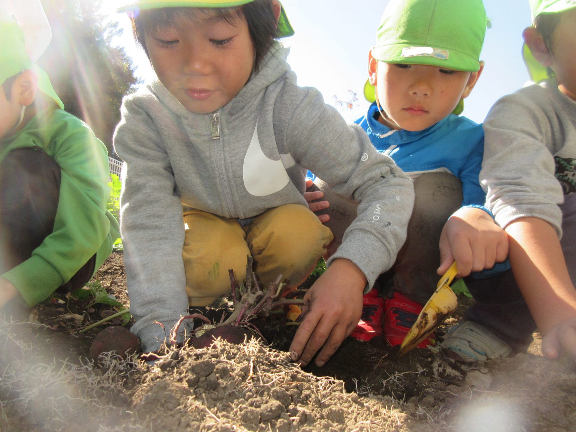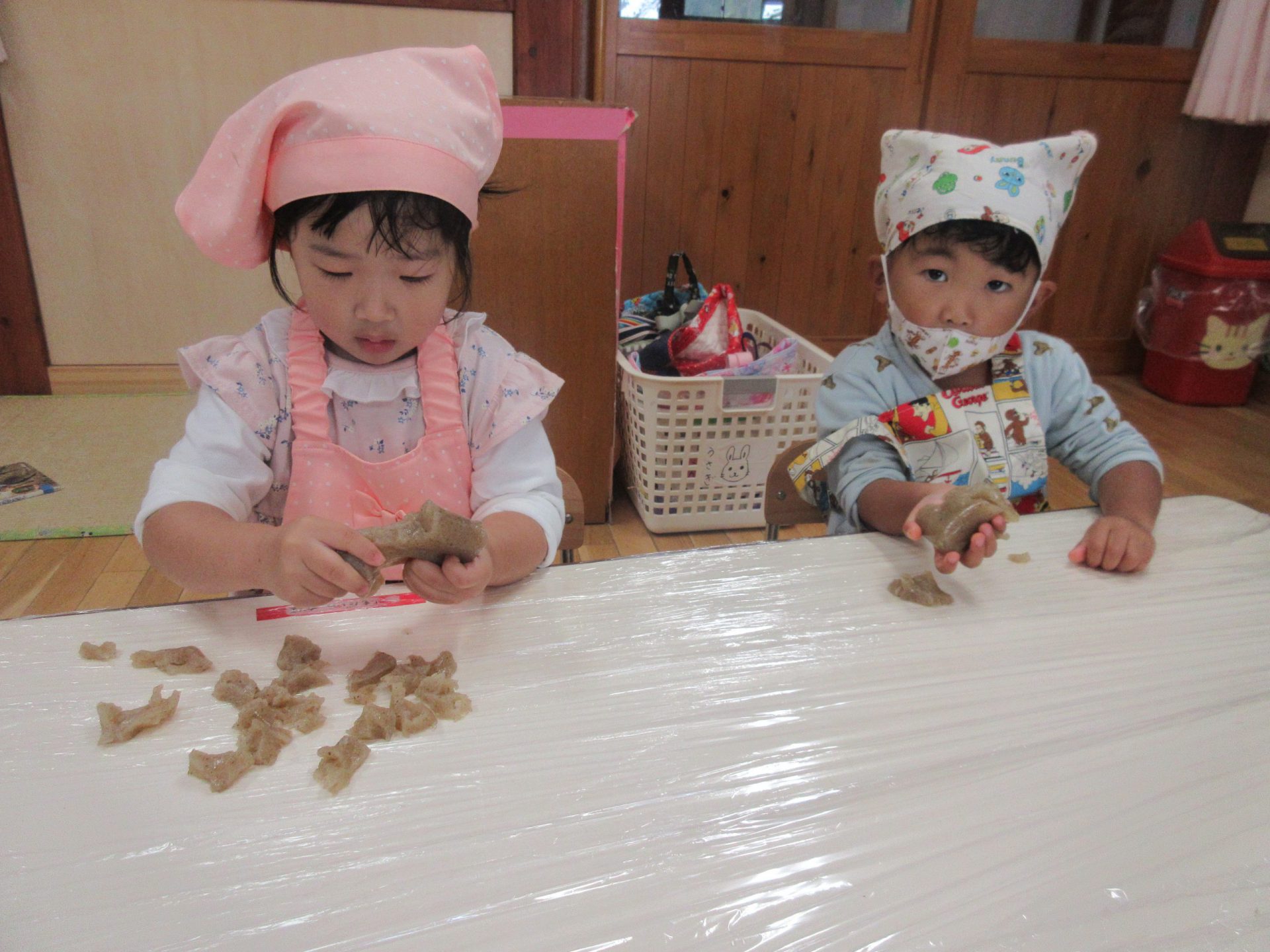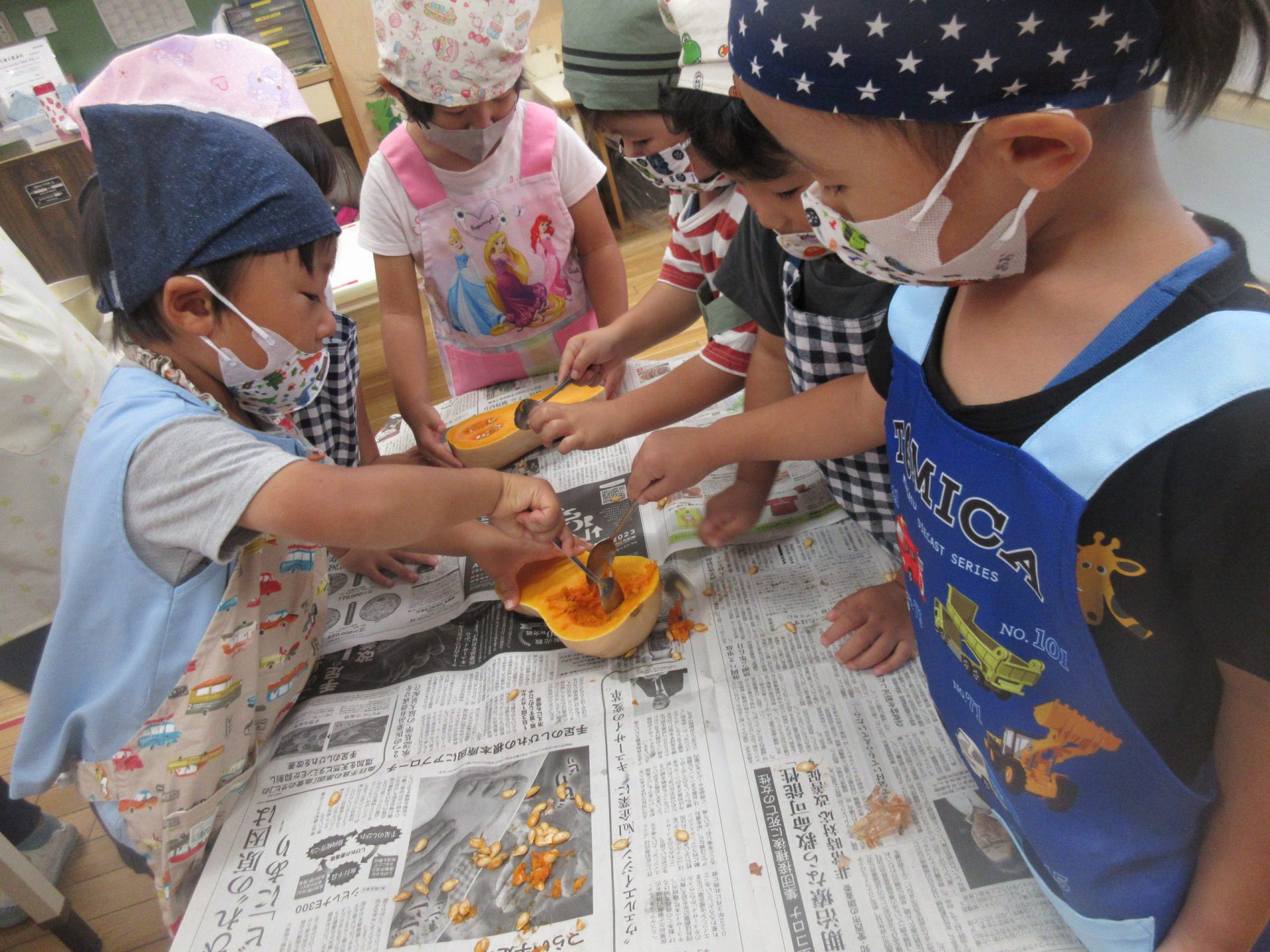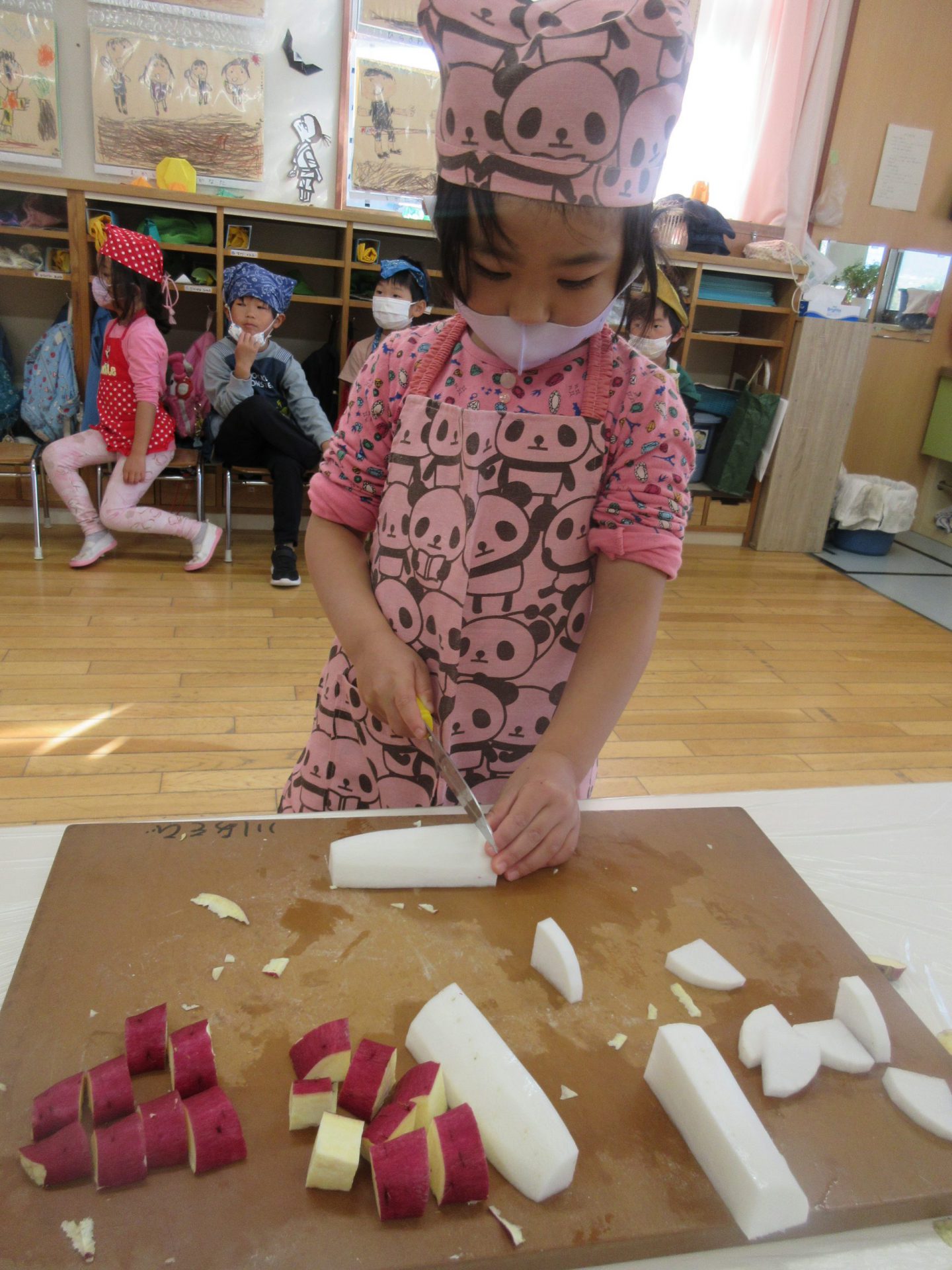 気の優しいS君は思わず自分から顔をだしました。 「すご~い」一生懸命探していた子ども達からの歓声が! よく考えたね!庭でお家の方に作っていただいた🍙と共に美味しいさつま汁をたくさん食べました。普段はコンニャクを食べない子も 自分のちぎったコンニャクを探しながらよく食べたそうです。
