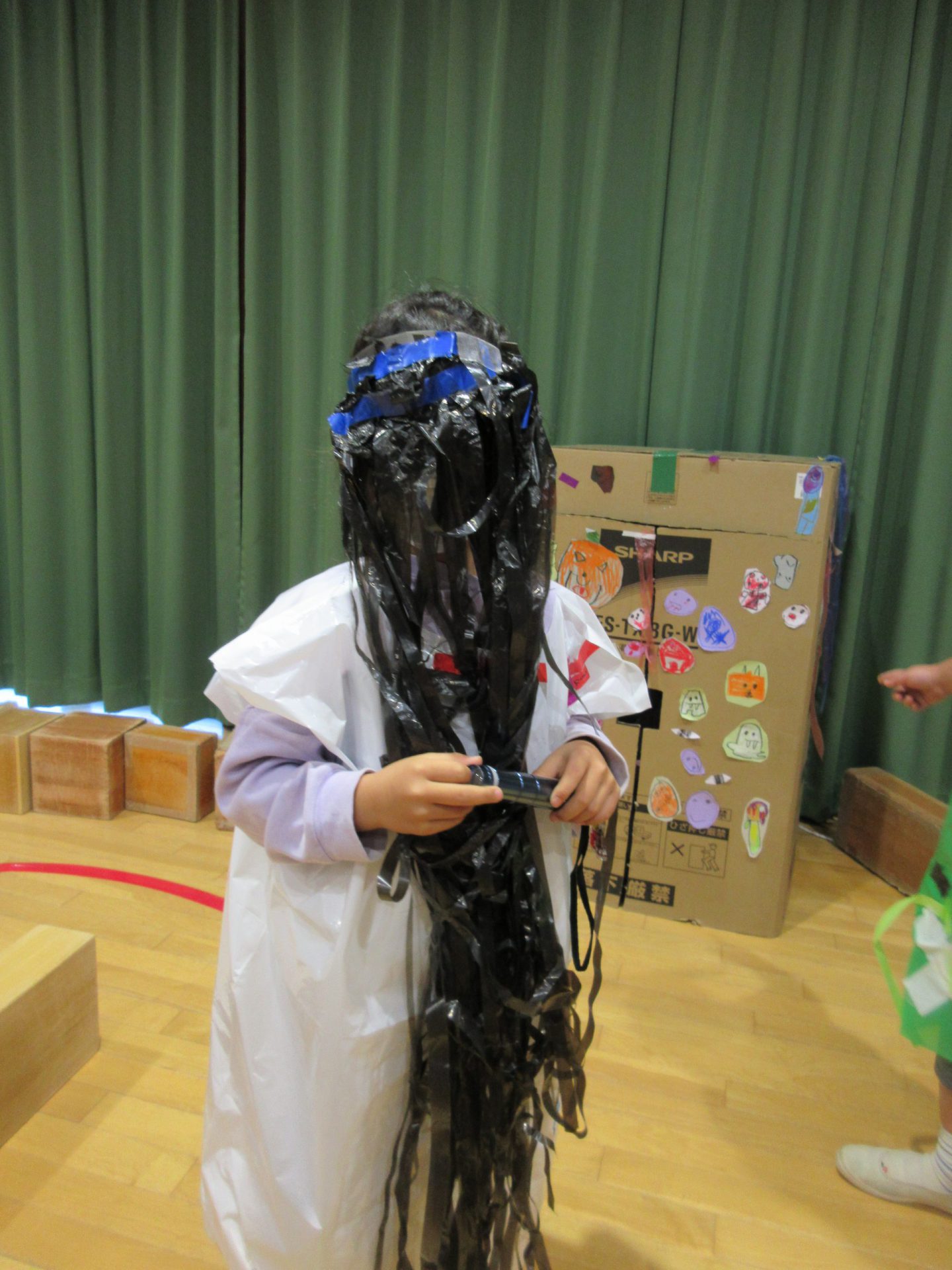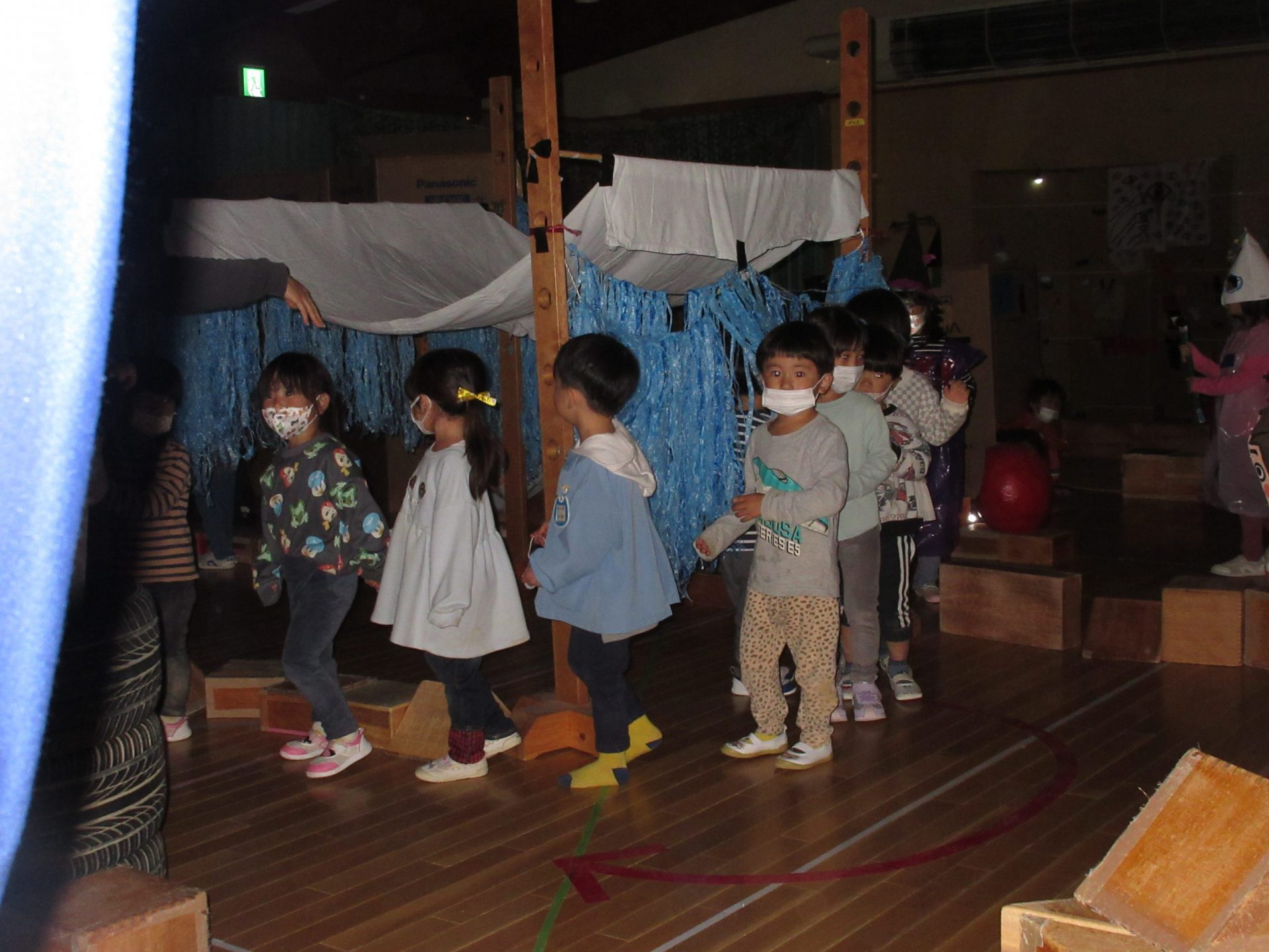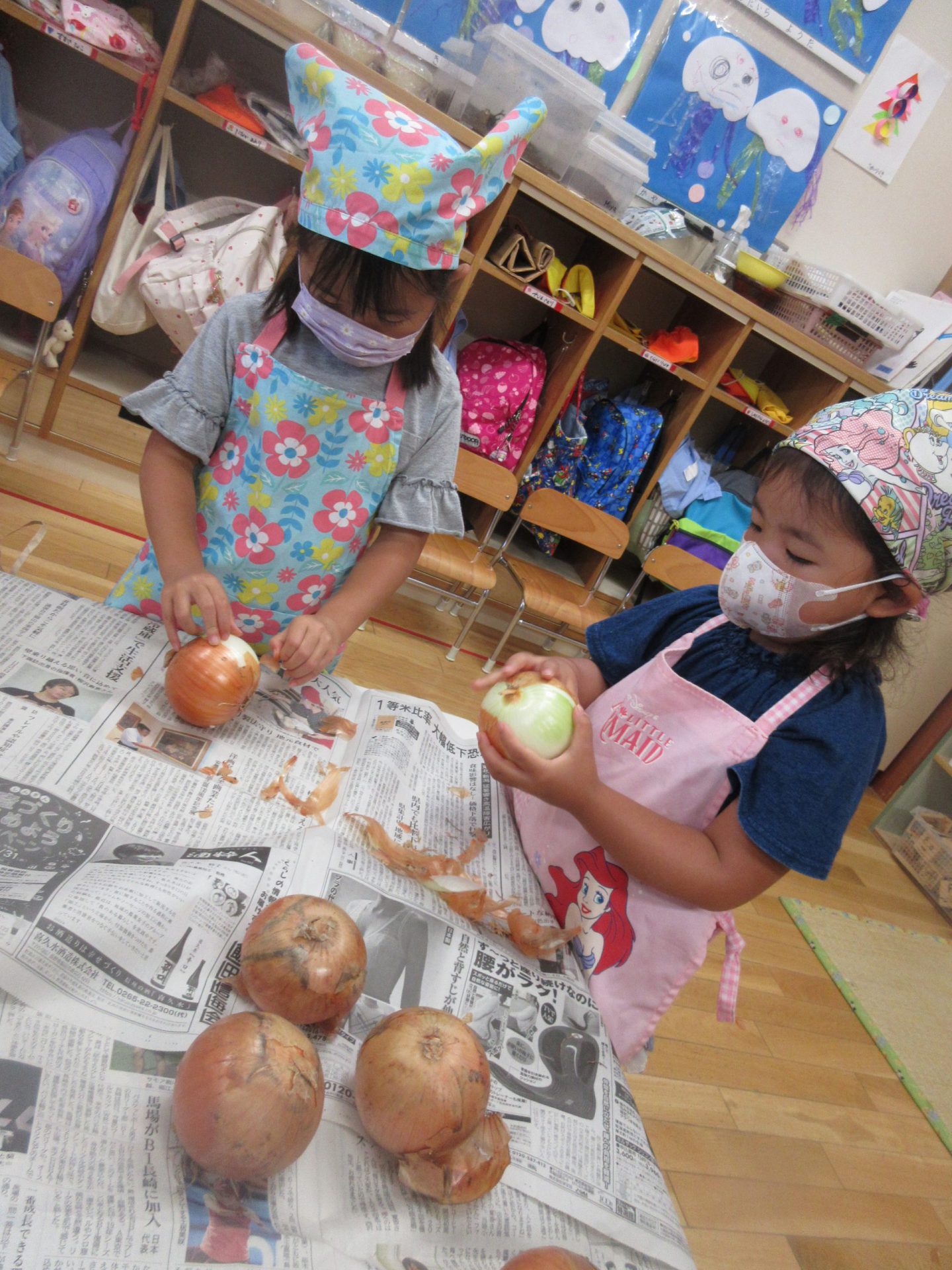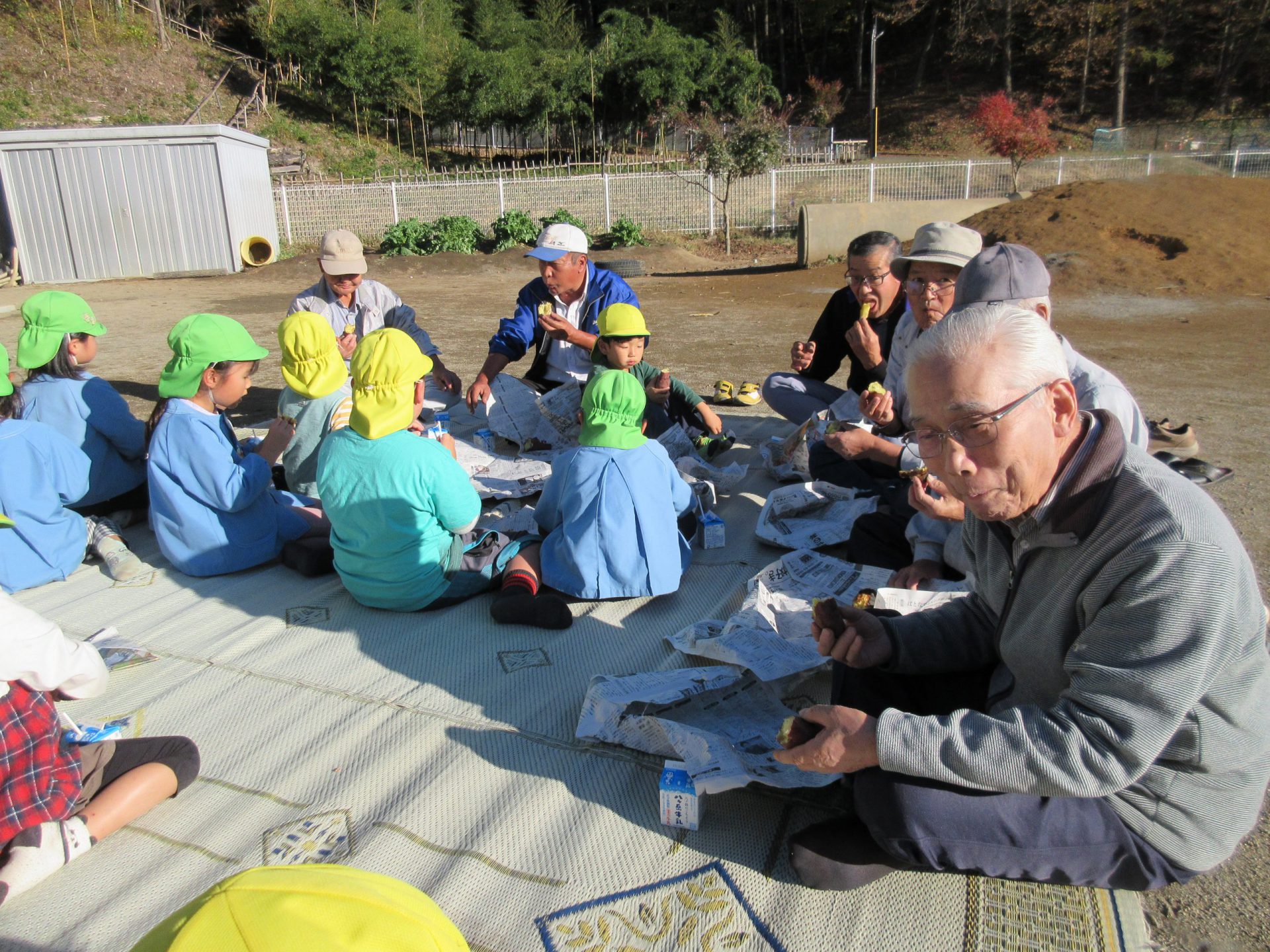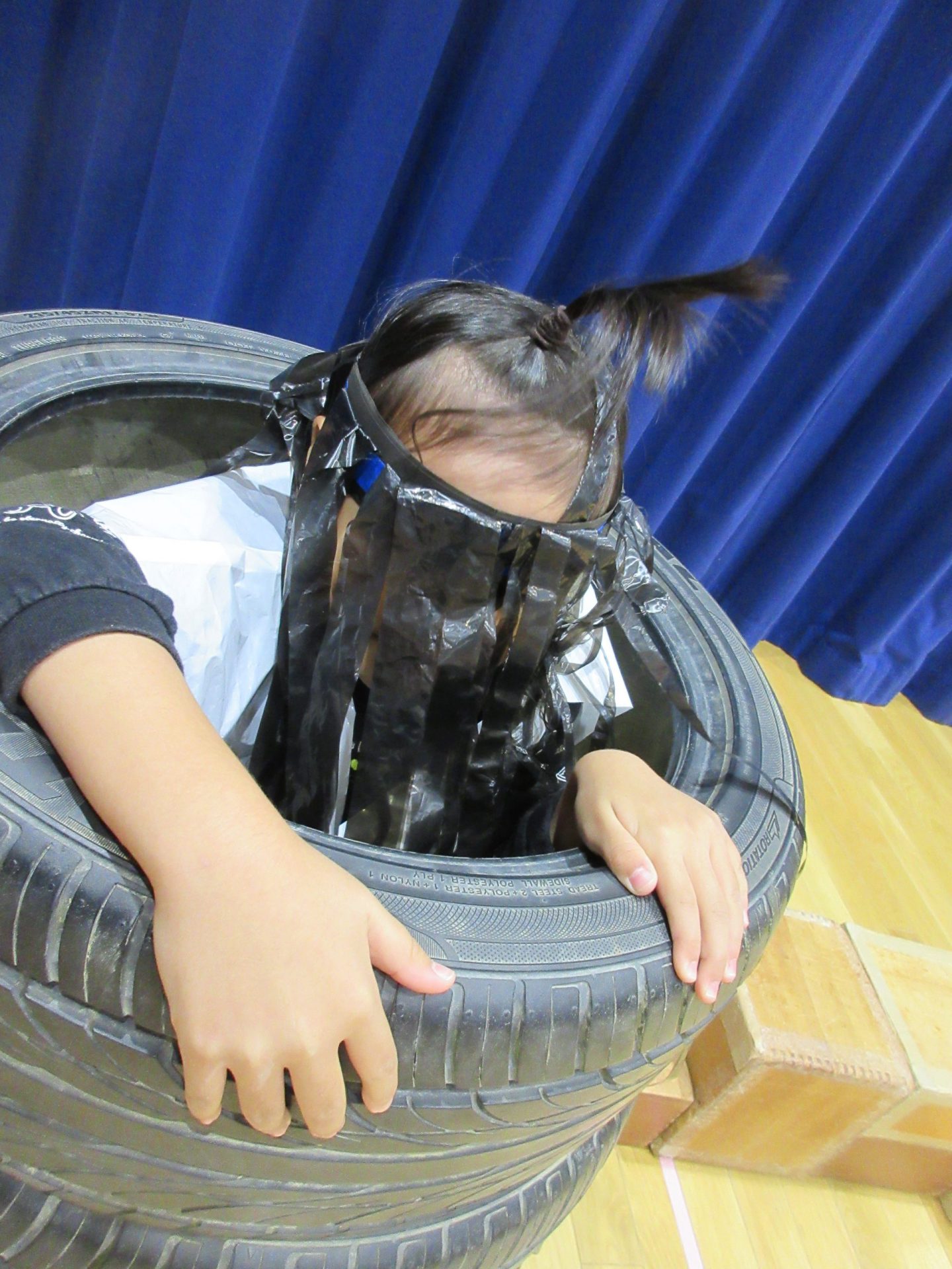 気の優しいS君は思わず自分から顔をだしました。 「すご~い」一生懸命探していた子ども達からの歓声が! よく考えたね!庭でお家の方に作っていただいた🍙と共に美味しいさつま汁をたくさん食べました。普段はコンニャクを食べない子も 自分のちぎったコンニャクを探しながらよく食べたそうです。