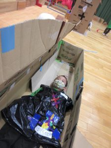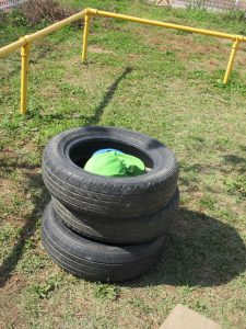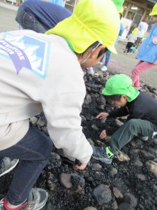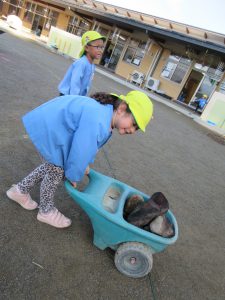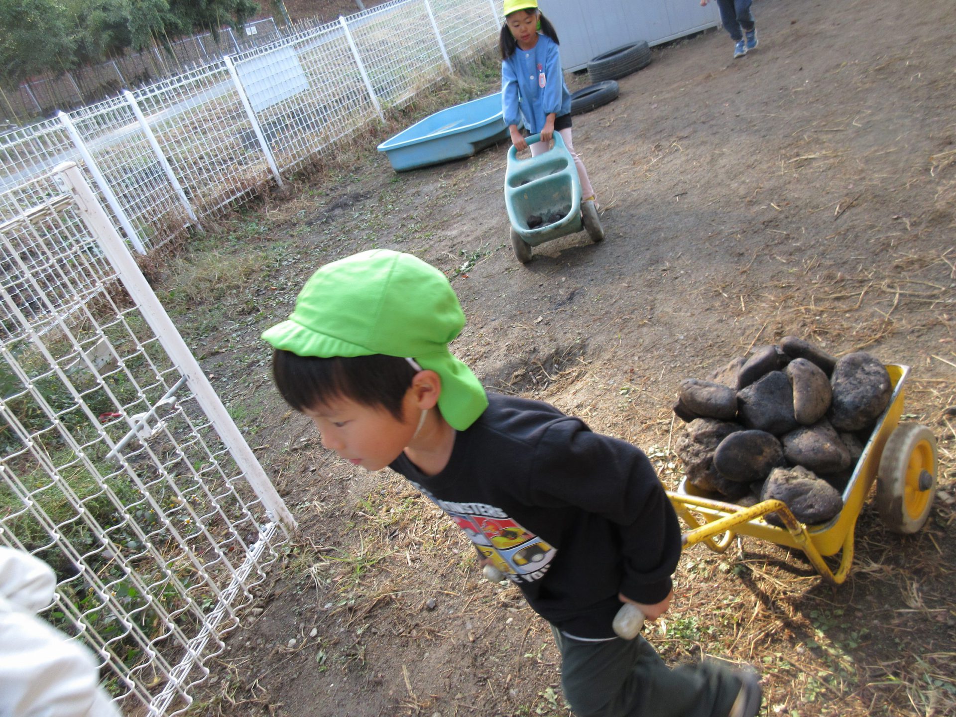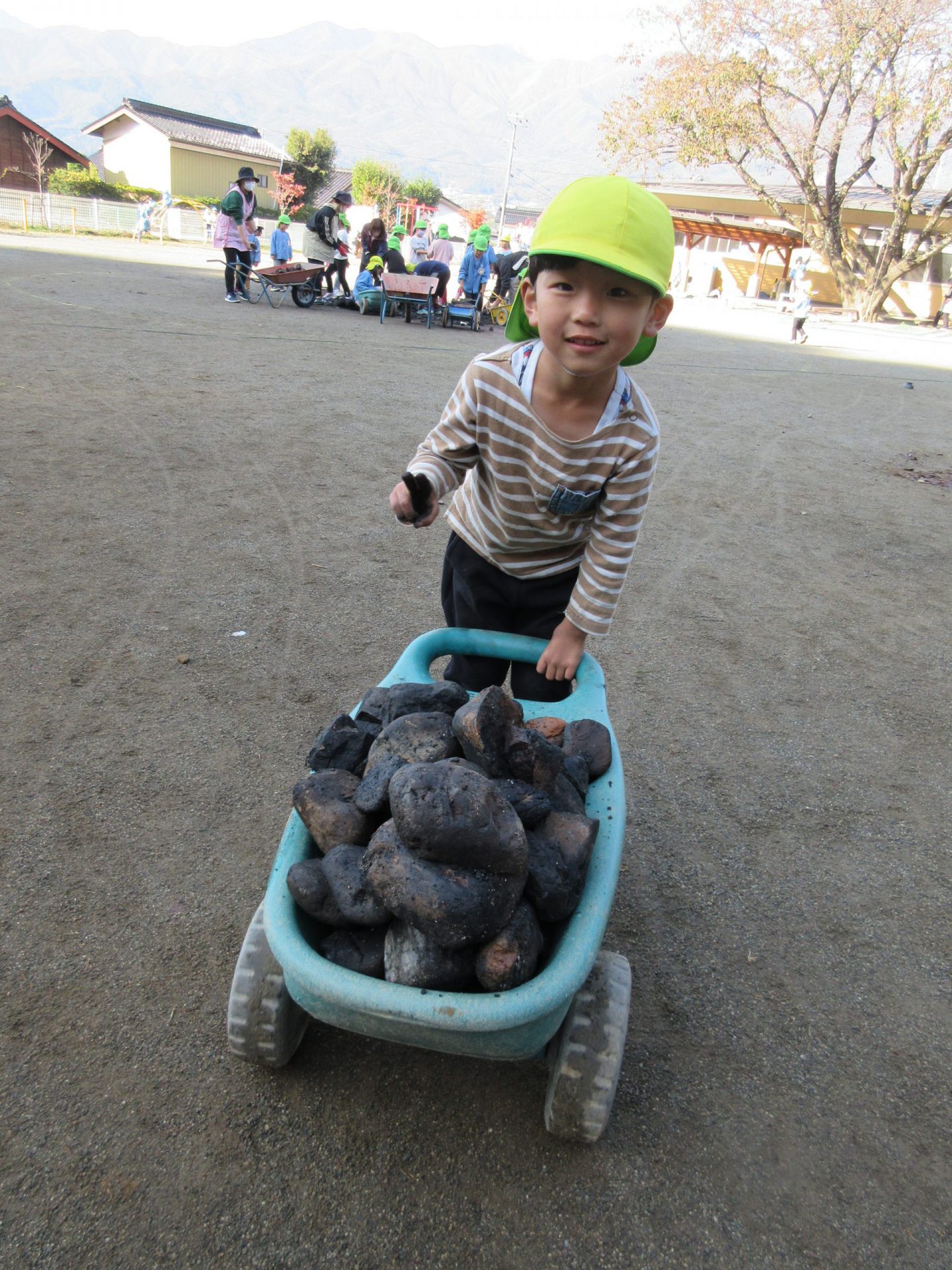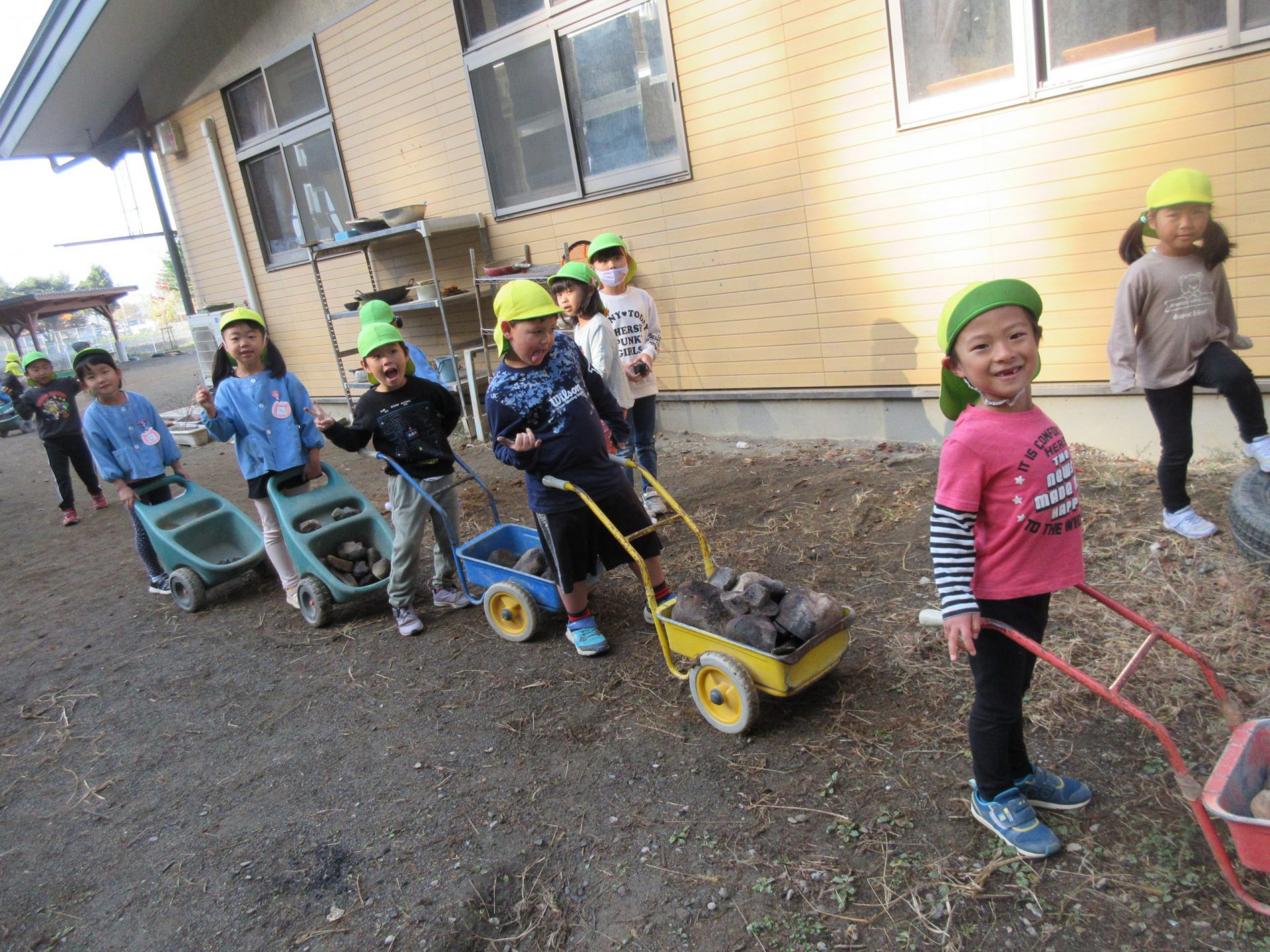 次の日。真っ黒の炭と石を片付ける年長さん。