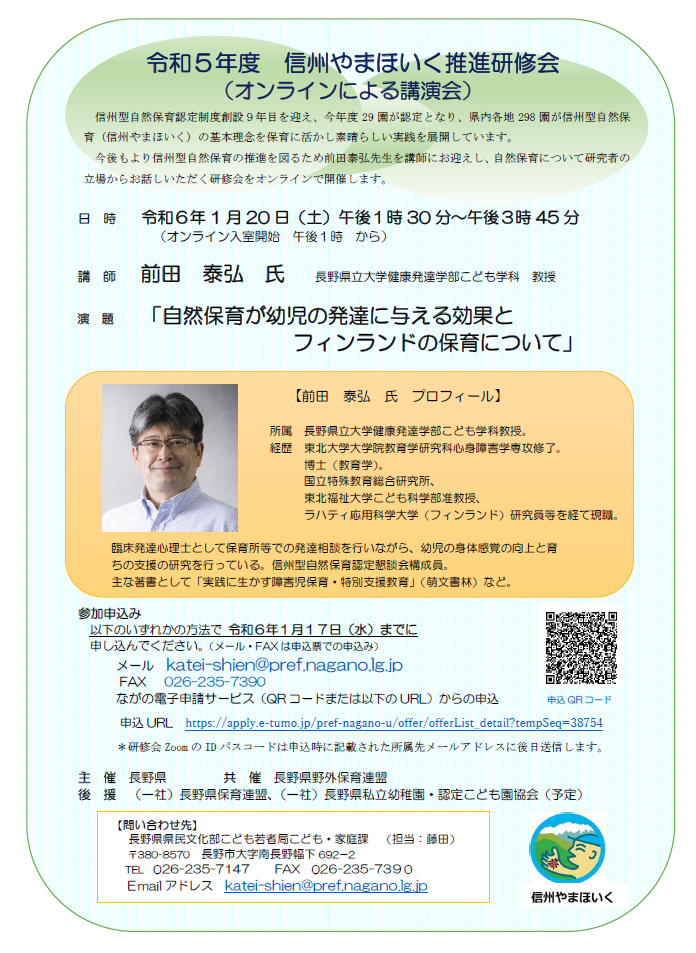信州型自然保育の推進を図るため前田泰弘先生を講師にお迎えし、自然保育について研究者の立場からお話しいただく研修会をオンラインで開催します。