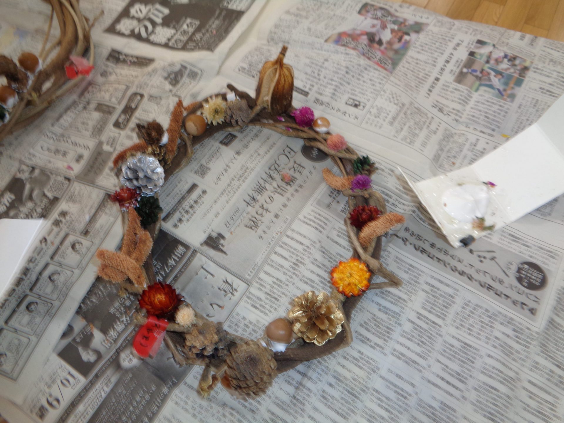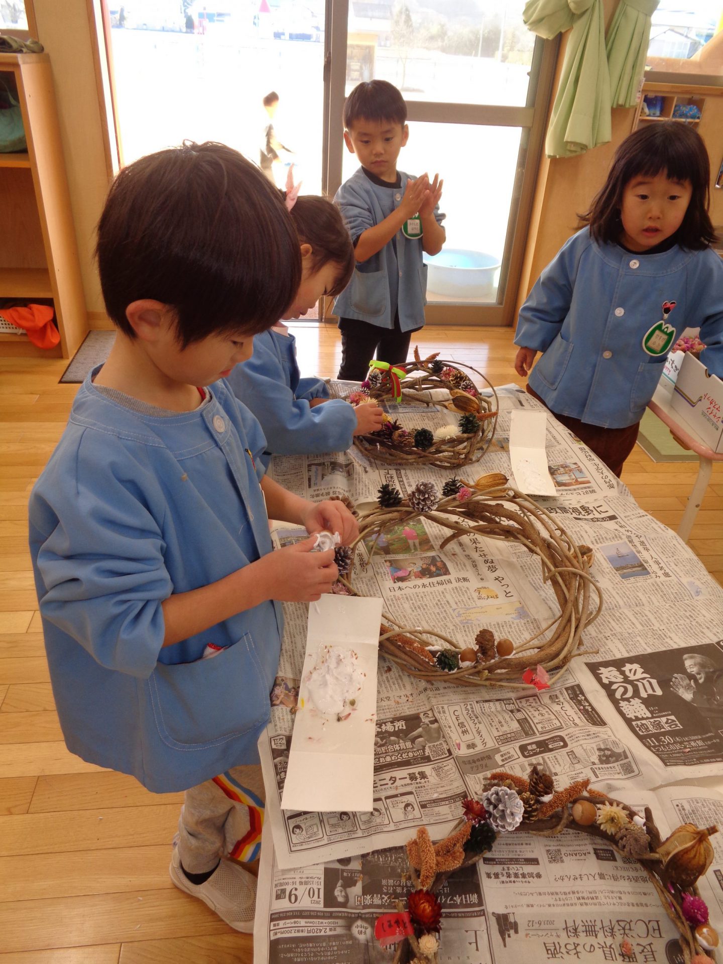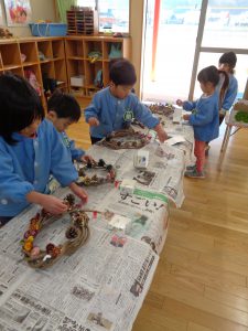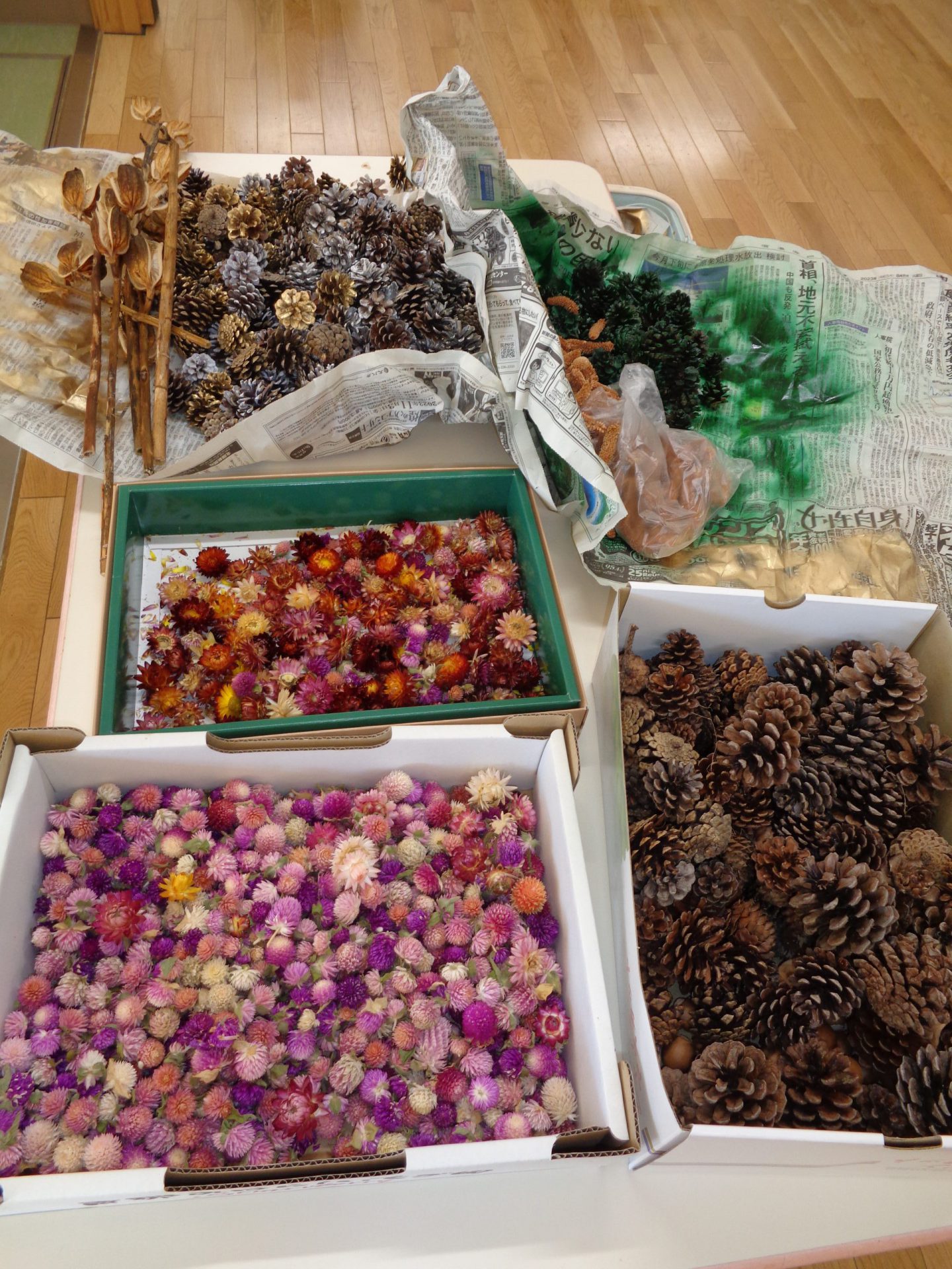 ドライフラワーは保護者のおうちの方からいただいた苗を園で育て花を摘んだものや、おうちの方にいただいたものを付けることにしました。