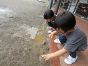 水たまりの上のシャボン玉が割れないことに気がついた子どもたちは、