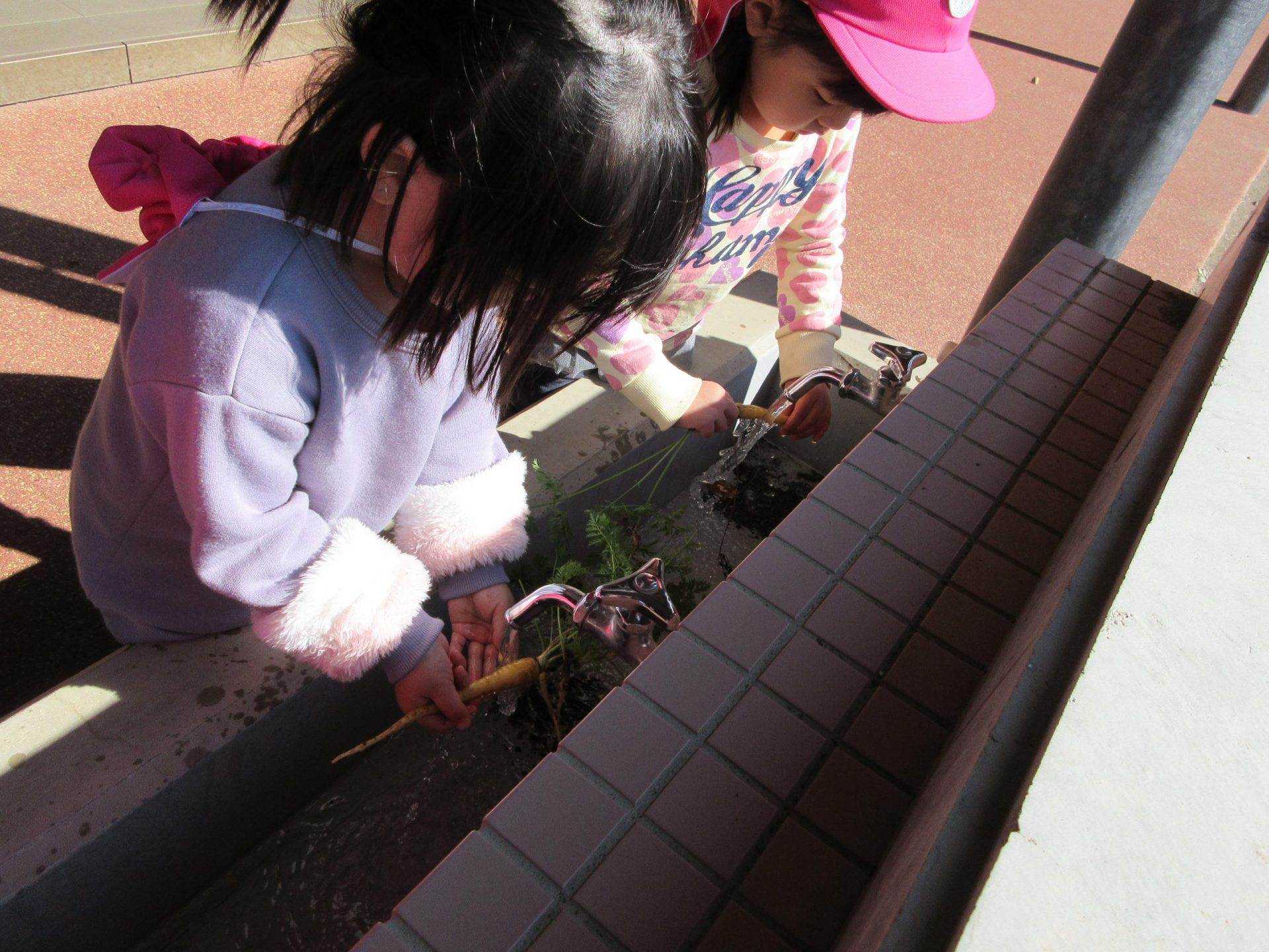 収穫した人参を洗ってから、給食室へ。