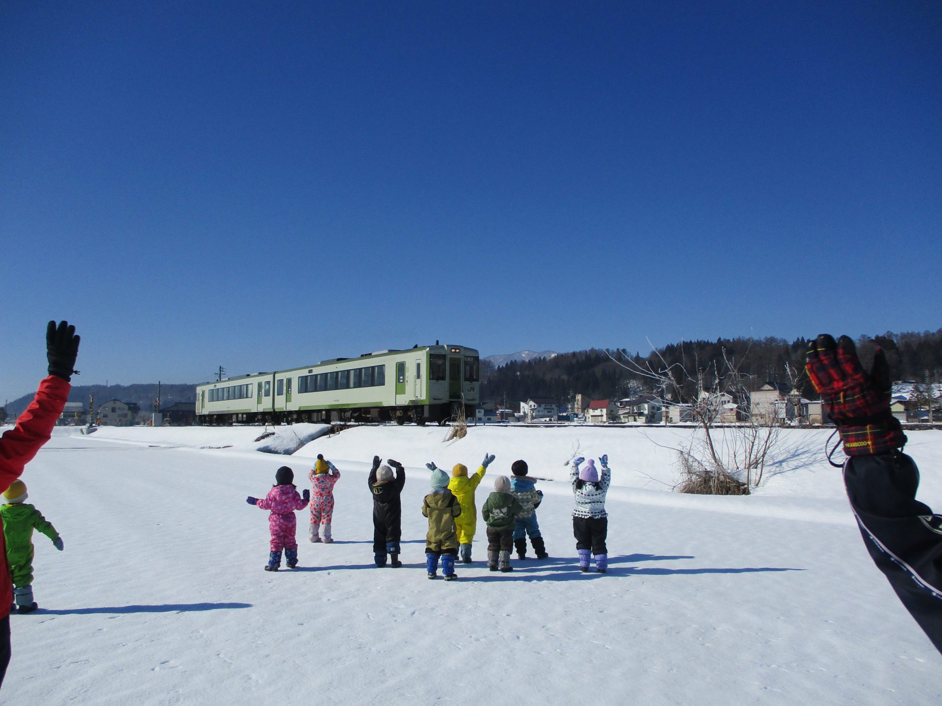保育園の近くには線路があり、時間になると飯山線が通ります。