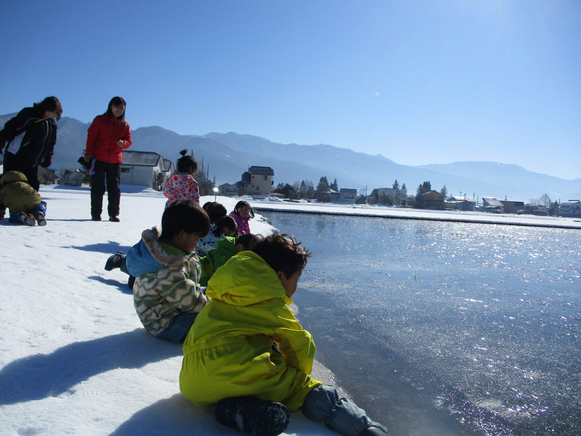 氷の張った田んぼがとても綺麗でみんなで眺めていると