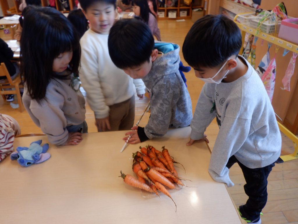 別の日。雪がだいぶ解け、秋に畑に残しておいたニンジンが大きくなっていたので、収穫しました。少し雪はあるけど、夜から大雪らしいよ。抜くなら今日がチャンス!