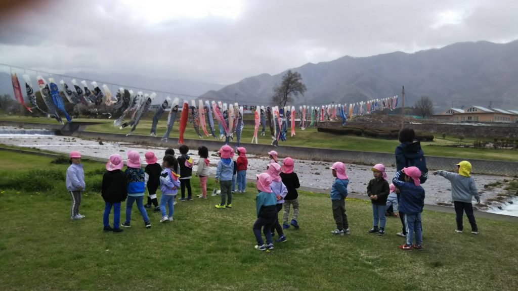 新4歳さん。天気が良い日はどんどんお散歩に行っています。距離も日に日に伸びて…散歩の途中から見えたこいのぼりに興味深々。先生が「明日こいのぼりさんに会いに行こうね~」とお話ししたようで、近くまで見に行くことを楽しみにしていました。