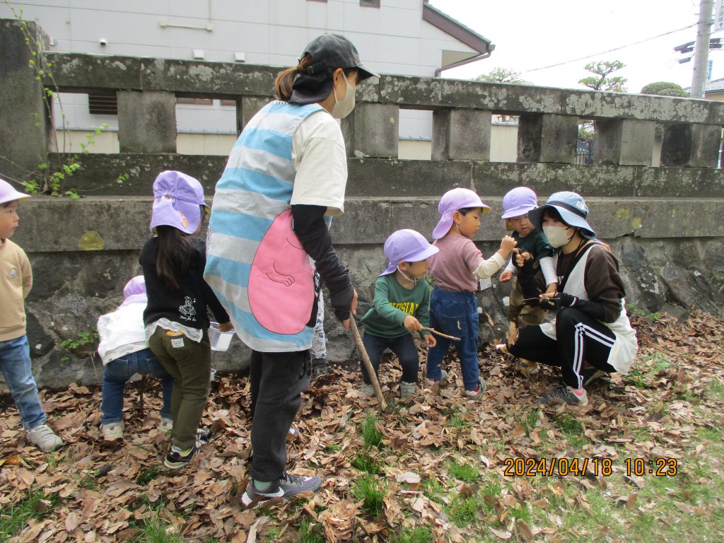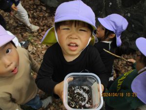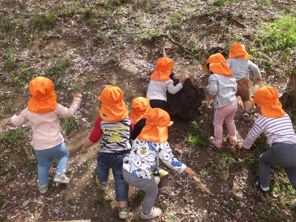 日陰のじめっとしたところには、子どもたちの宝物がいっぱい隠れています。そっと葉っぱをかき分けて夢中でさがしています。
