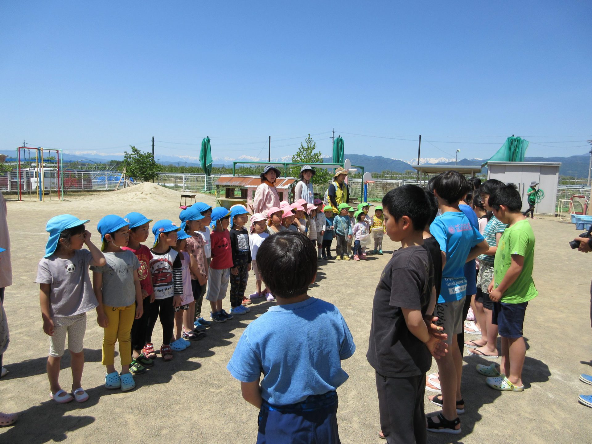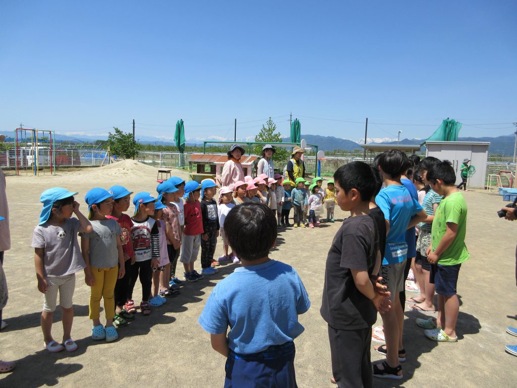 5月10日気持ちの良い青空です。千曲保育園で身支度を整えて、お兄さんお姉さんと手をつないで、田んぼへ向かいました。