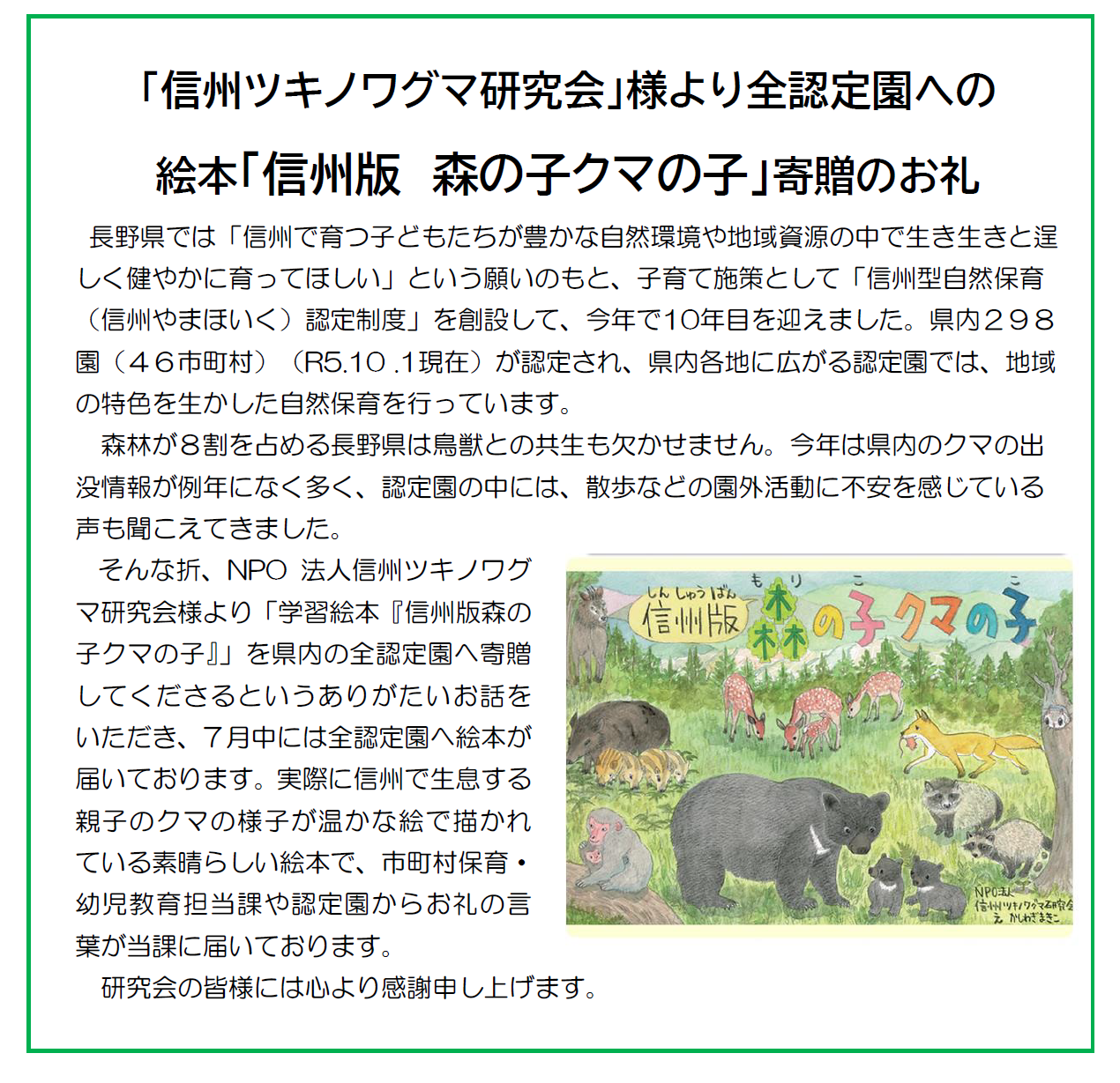 2024.08.02 「信州ツキノワグマ研究会」様より全認定園への 絵本「信州版 森の子クマの子」寄贈していただきました