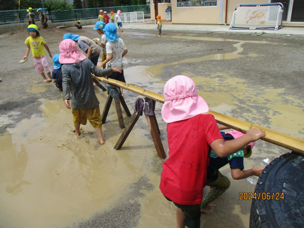 園庭の端には、川ができました。喜んで川の中を走ります。