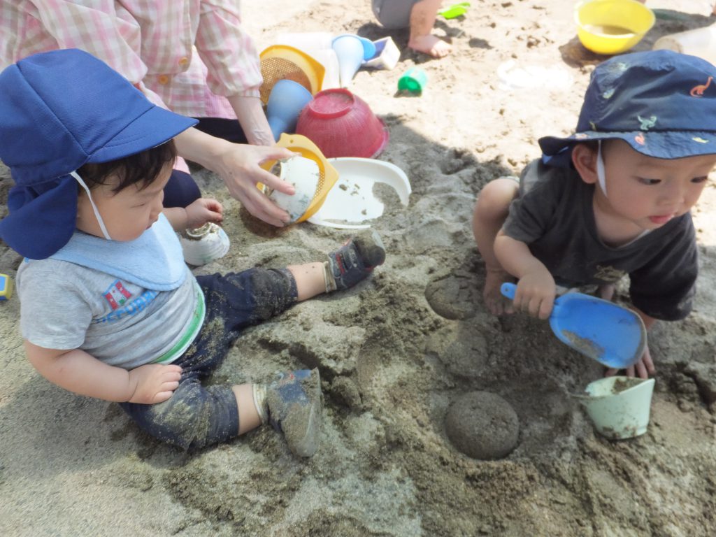 生まれて初めてのどろんこあそびの前に、お砂に慣れておきましょう。ショベルで砂をすくったり、戻したり…