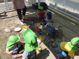 最初の頃は、足についた砂がくすっぐたいのか裸足で砂場に降りることを嫌がっていた子も、今ではみんなと一緒に遊んでいます。