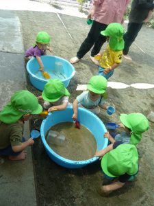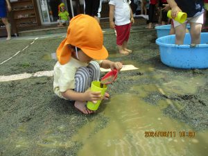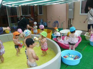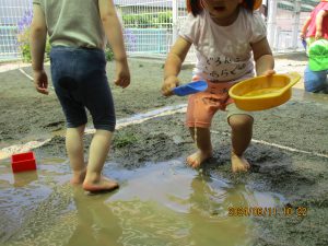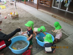 1歳のお友だちと一緒に桶から水をすくってみたり、 先生からお水を入れてもらったりしてあそんでいます。