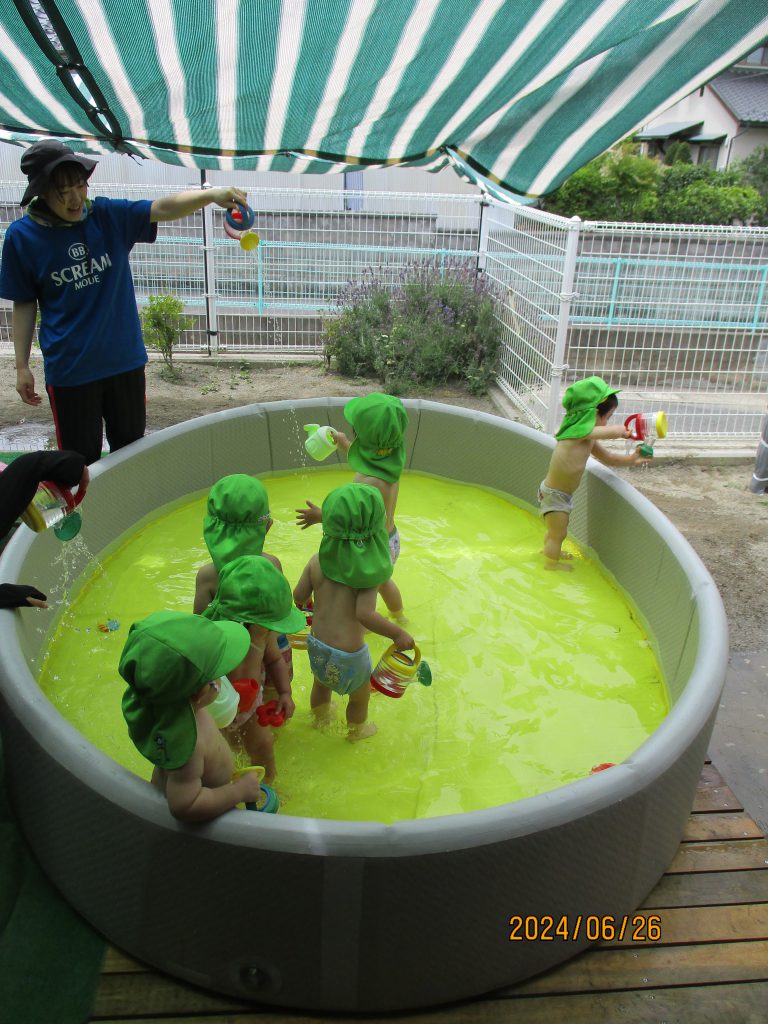 水の冷たさや心地よさを感じ、水面が揺れてキラキラしたり上がった水しぶきにまぶしさを感じたり、水鉄砲で勢いよく水が押し出されることを知ったり、毎日プールあそびを楽しみました♬