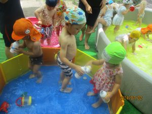 3歳児はお顔にお水がついても平気なように、手ですくったお水に息を吹きかけるあそびです。