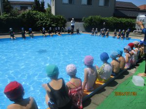 お水の神様が来てくれて、無事に楽しくプールあそびができるようにみんなでお祈りをして、プール開きです。