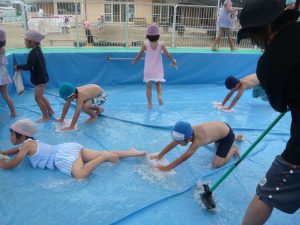 年長さんがプールのお掃除をしてくれました。 頑張って雑巾でゴシゴシ