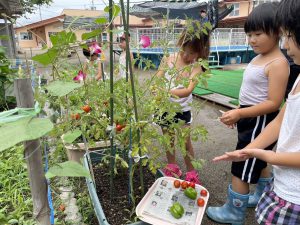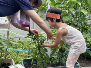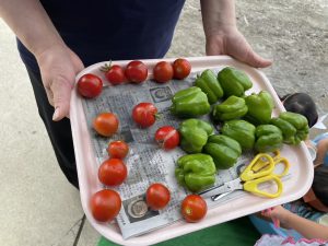 トマトは手で簡単に取れるけれど、ピーマンは難しいね。でも、みんなでたくさん収穫できました。